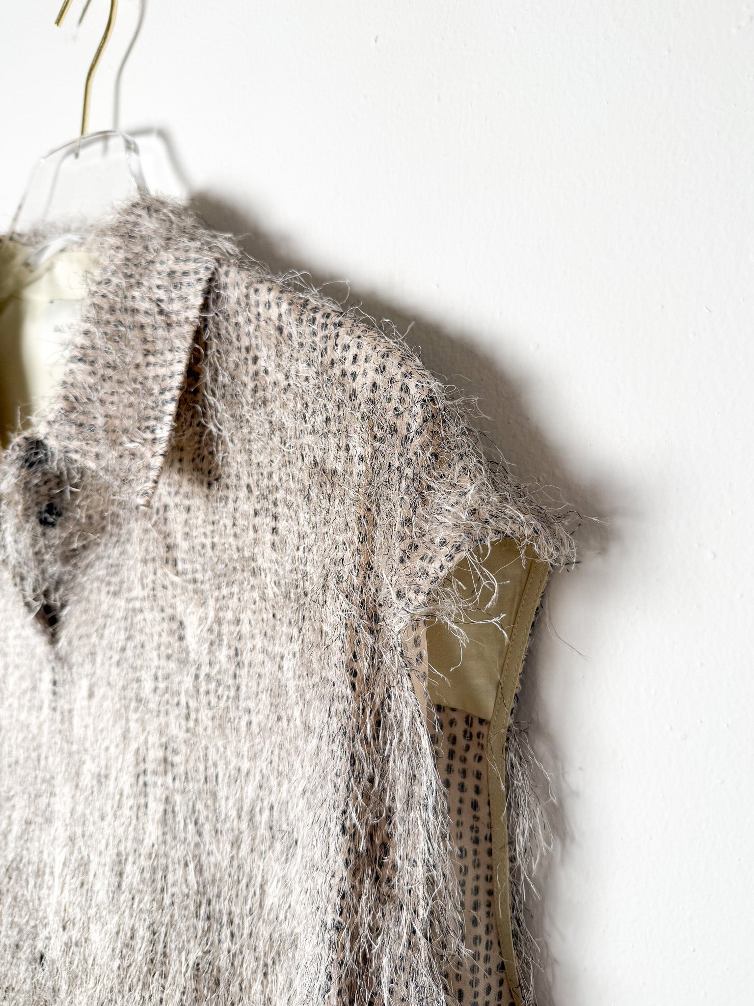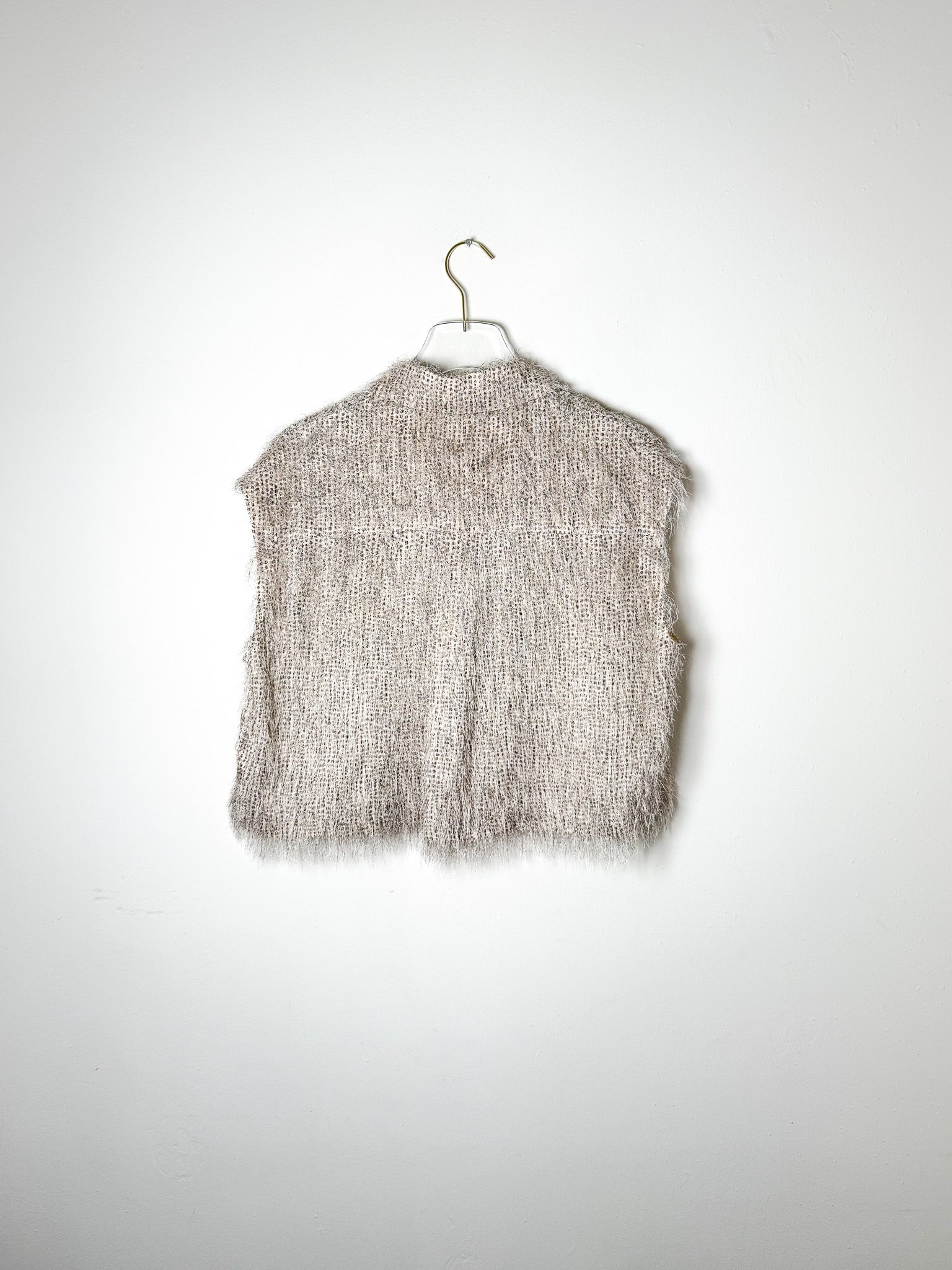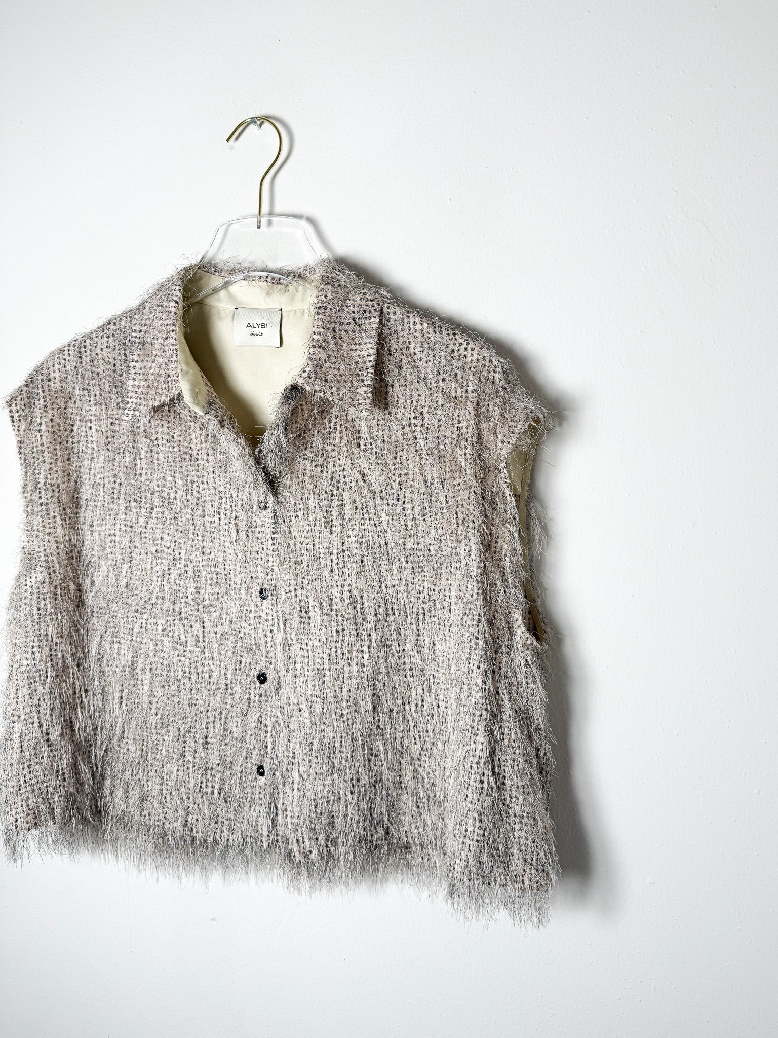 Sleeveless button-front crop with delicate fringe accents across the fabric.