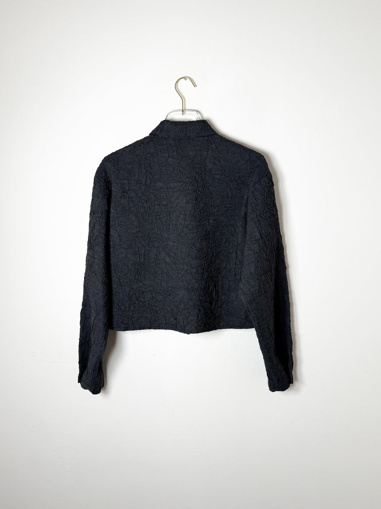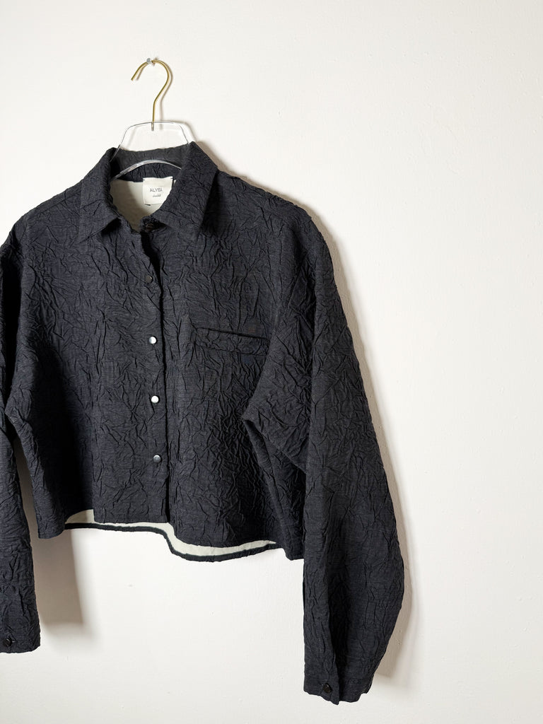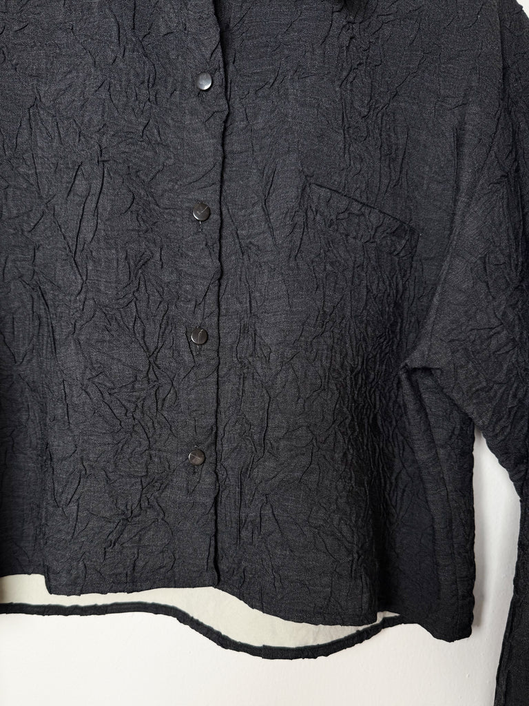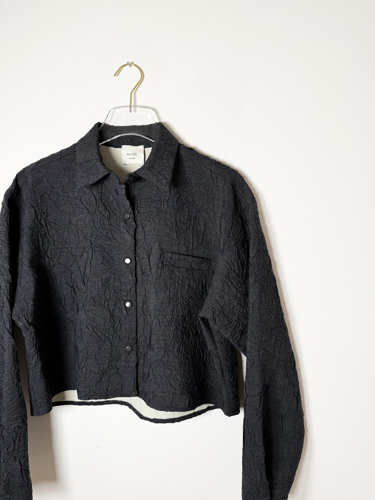 This cropped button-down features a collar and a fully lined interior. Its charcoal-colored textured fabric adds subtle depth, making it versatile to wear either as a top or layered like a jacket.
