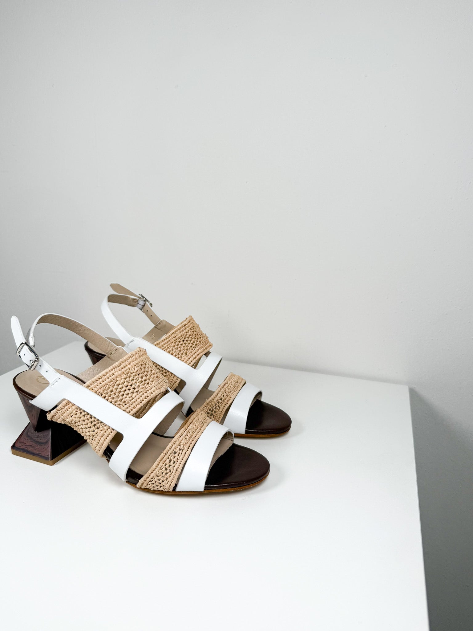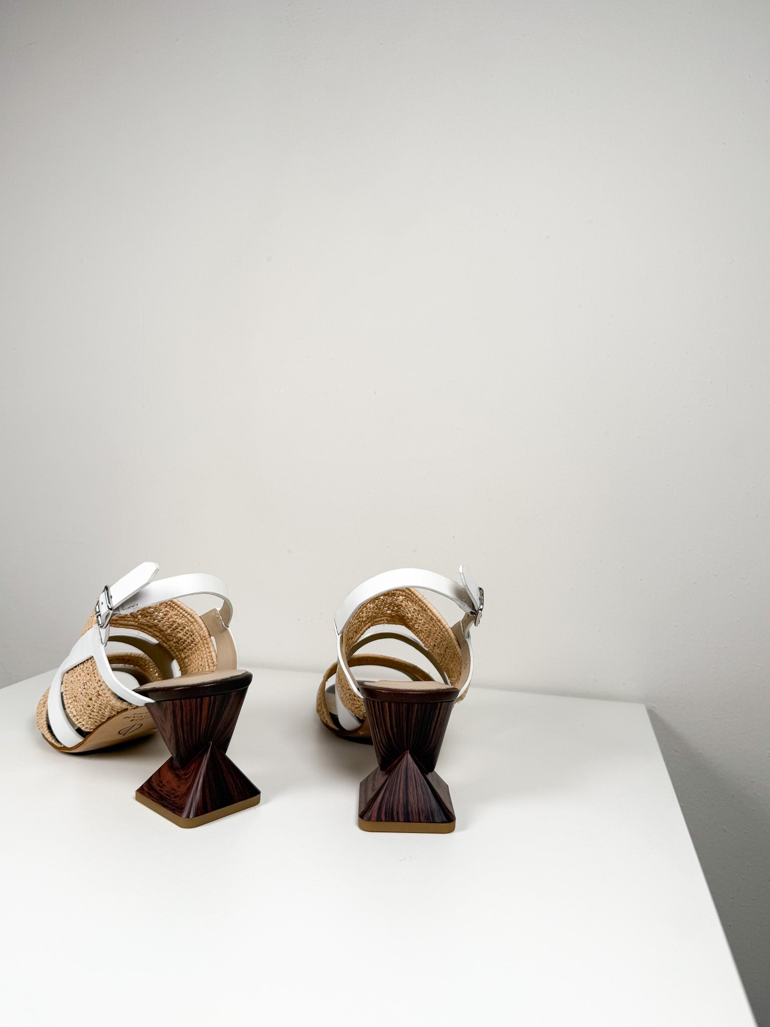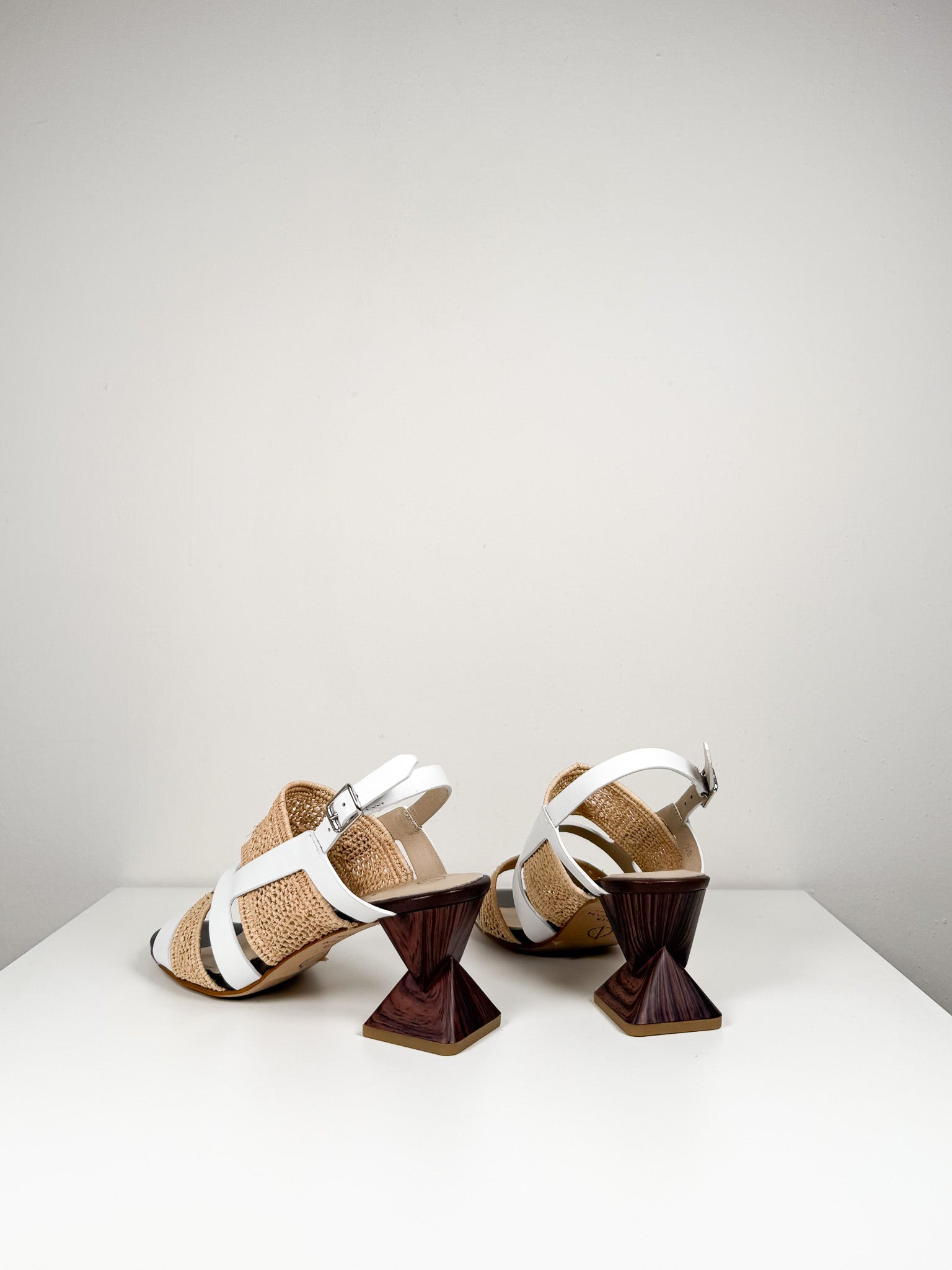 Elegant summer heel featuring leather and raffia construction with an adjustable ankle strap.