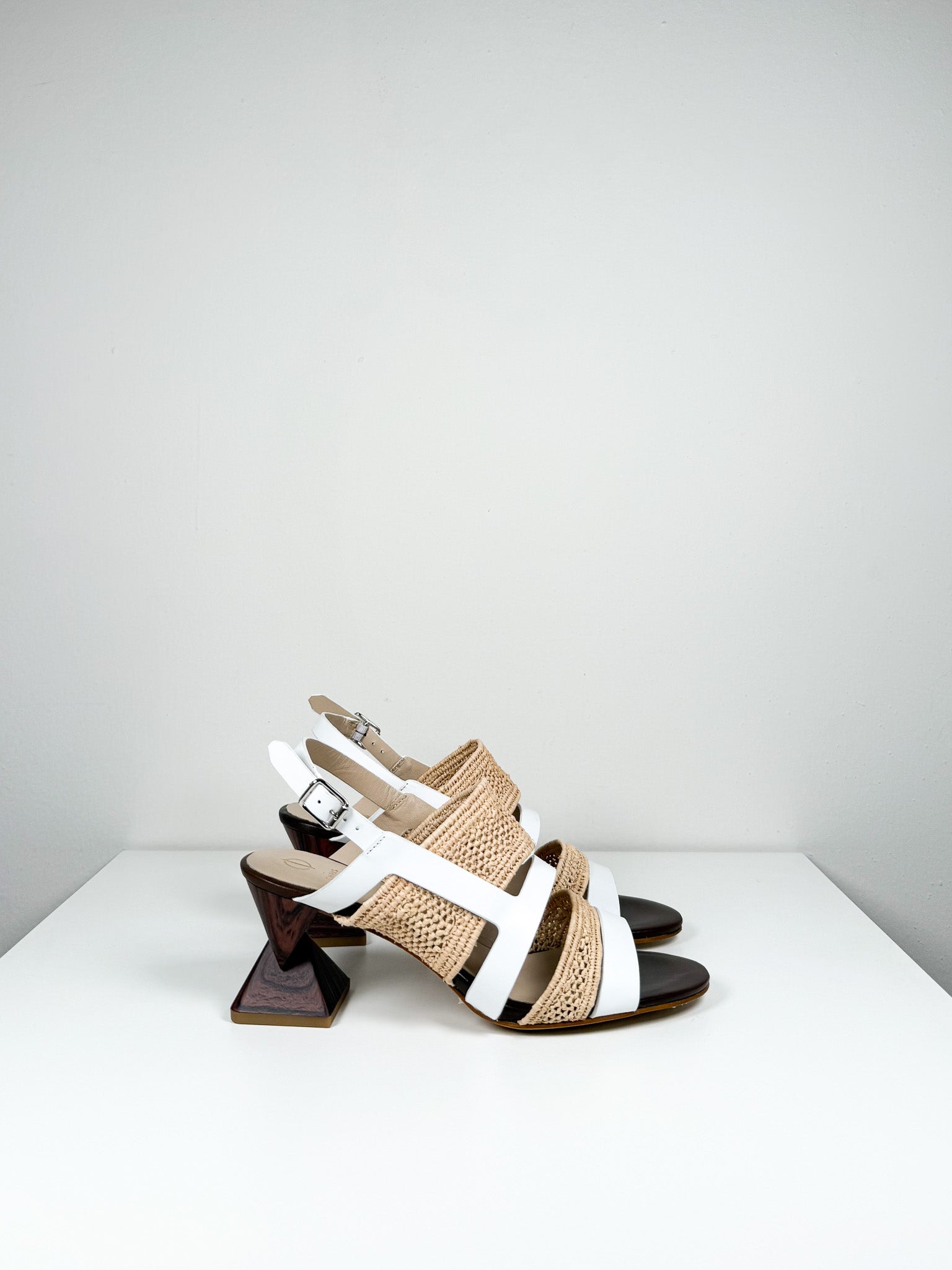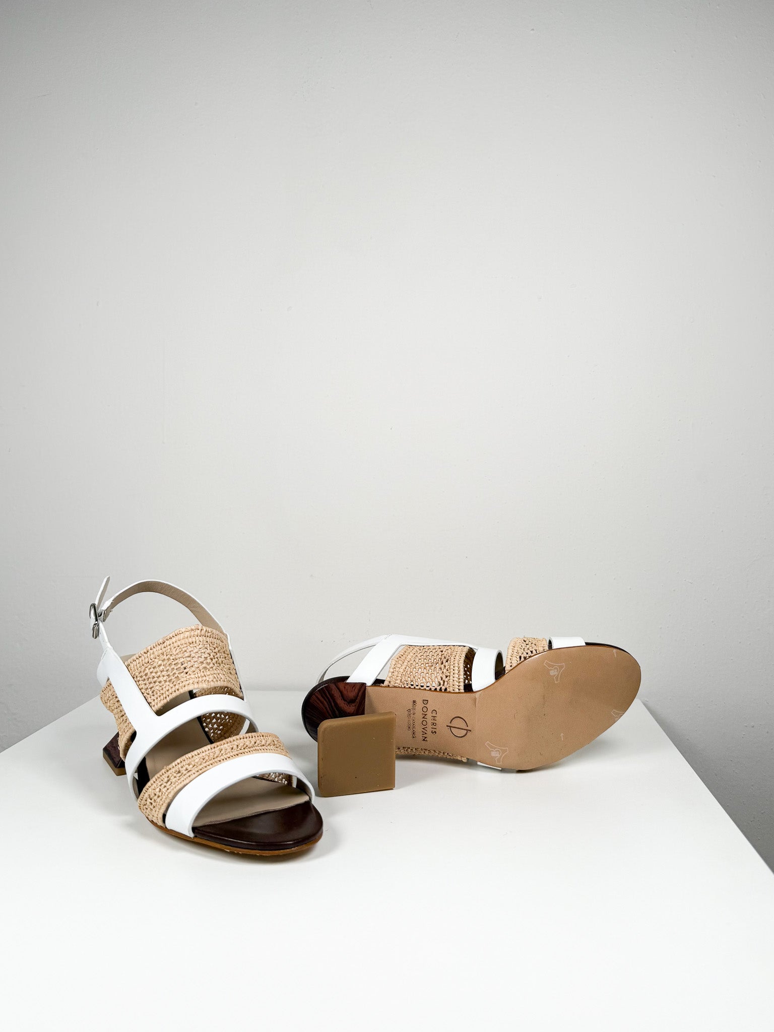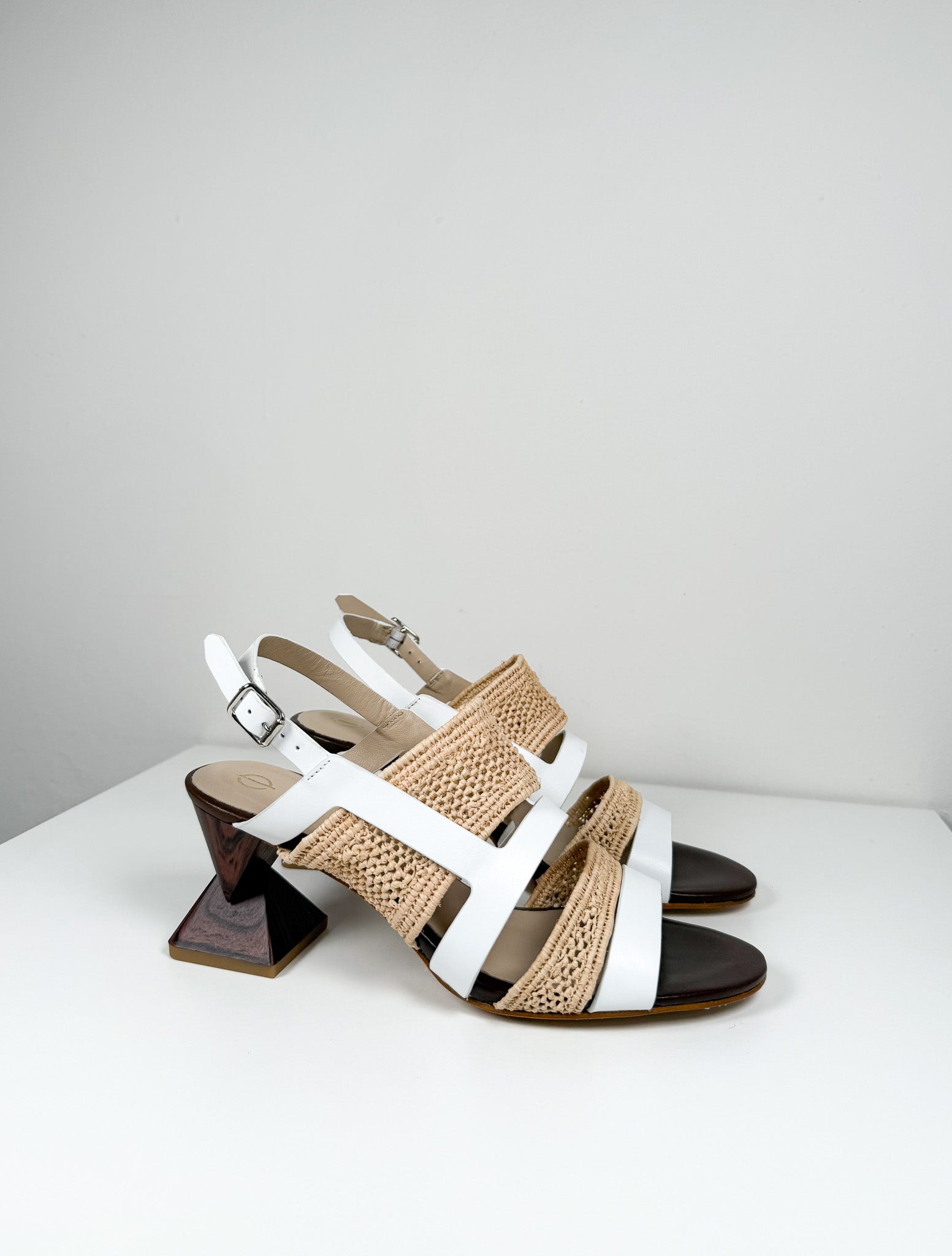 Elegant summer heel featuring leather and raffia construction with an adjustable ankle strap.