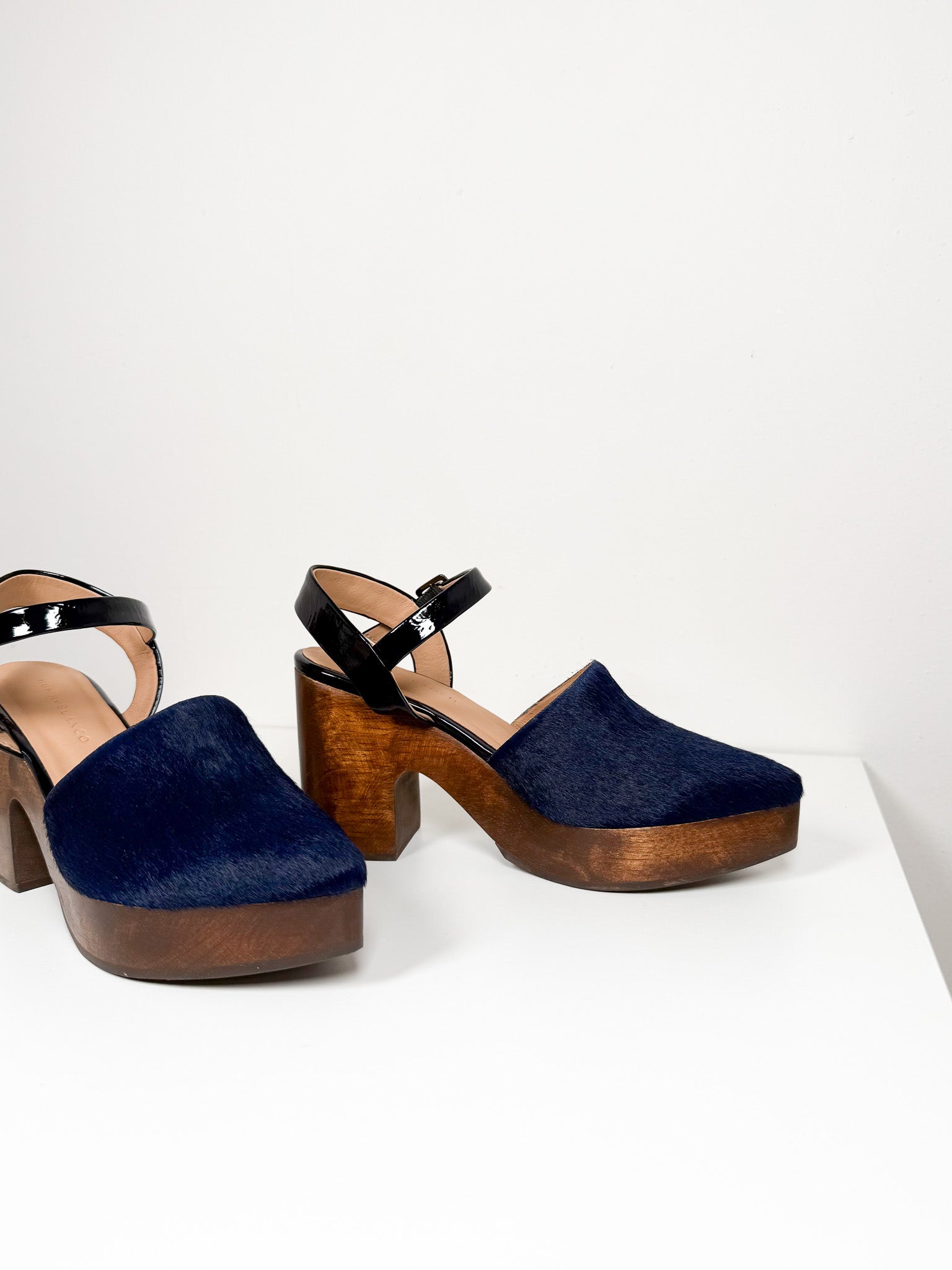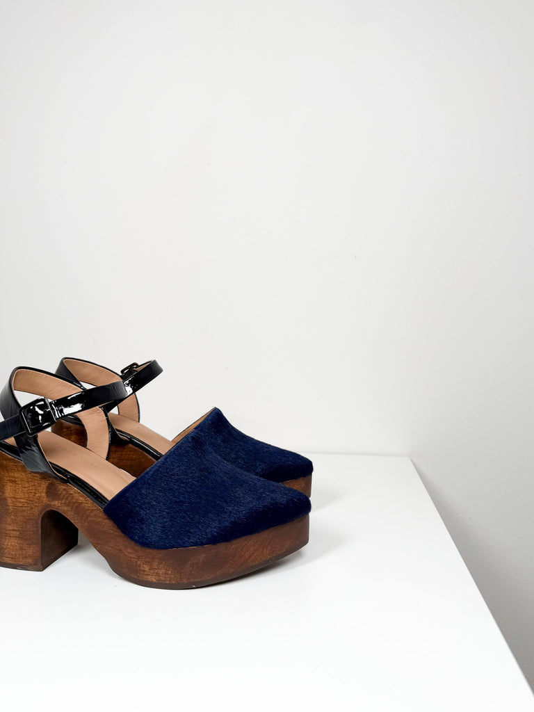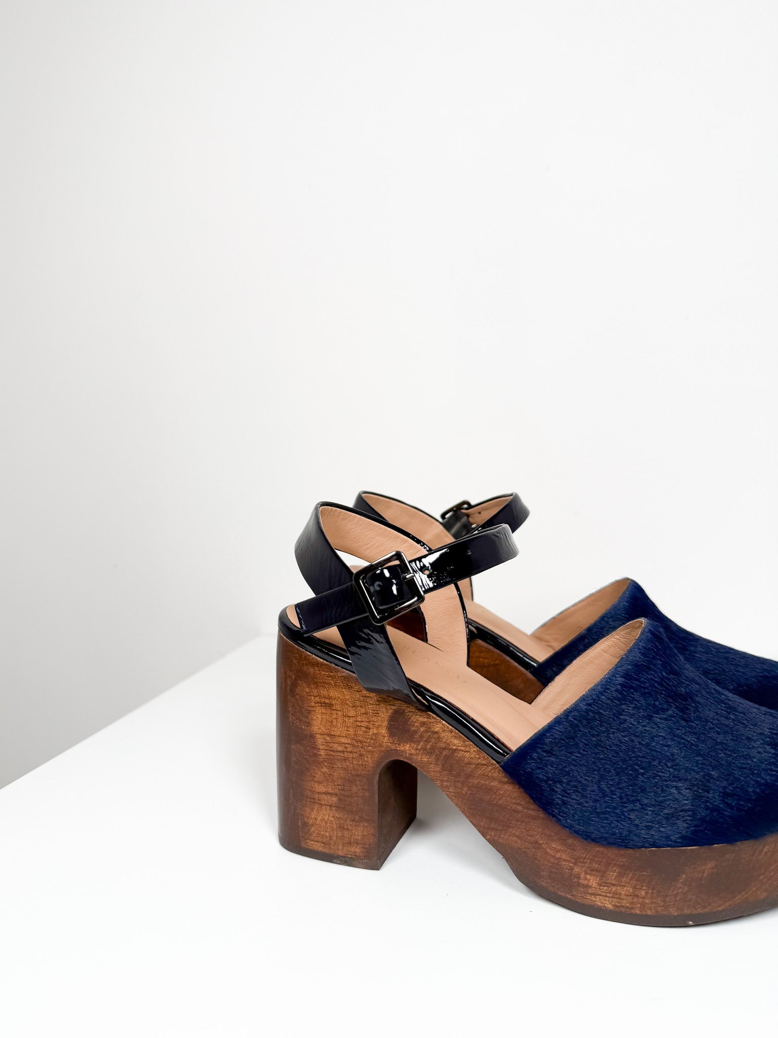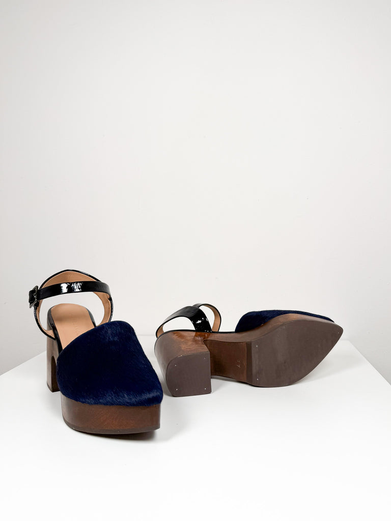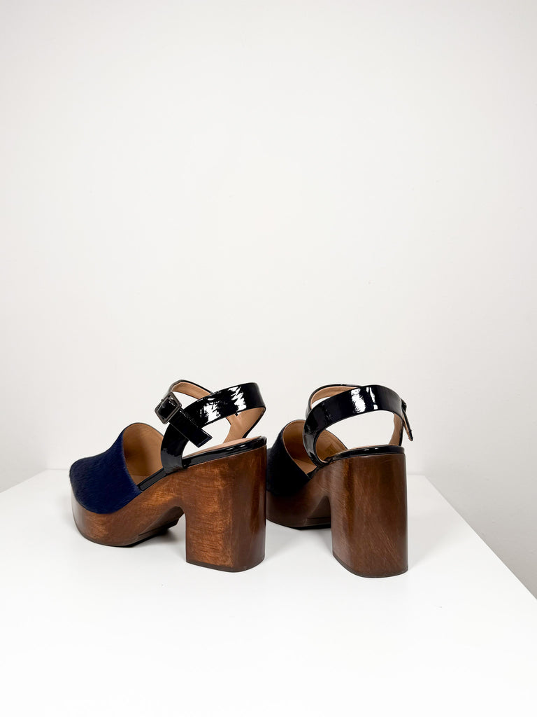Closed-toe platform shoes featuring navy calf leather on the pointed toe with adjustable patent leather ankle straps.