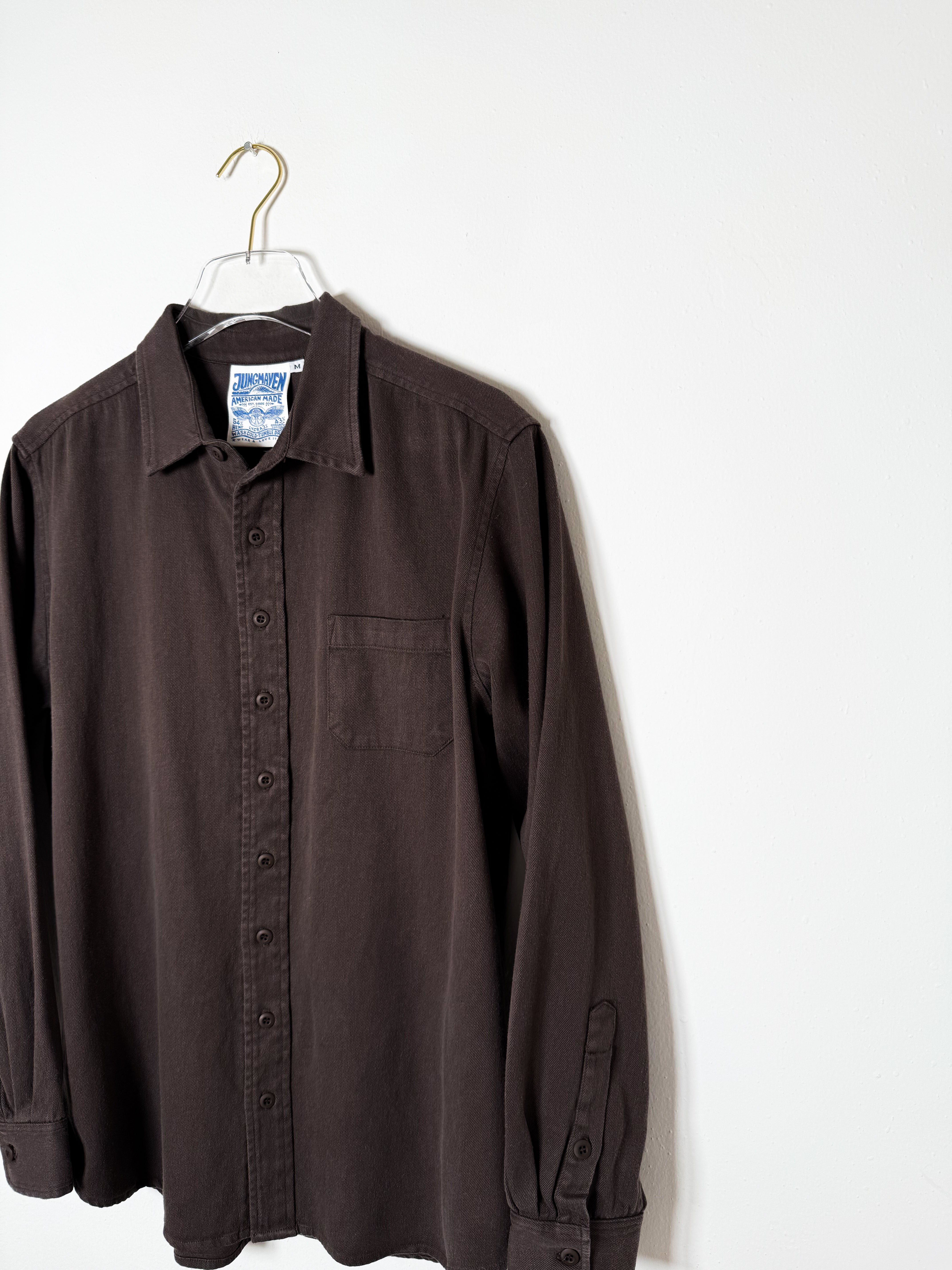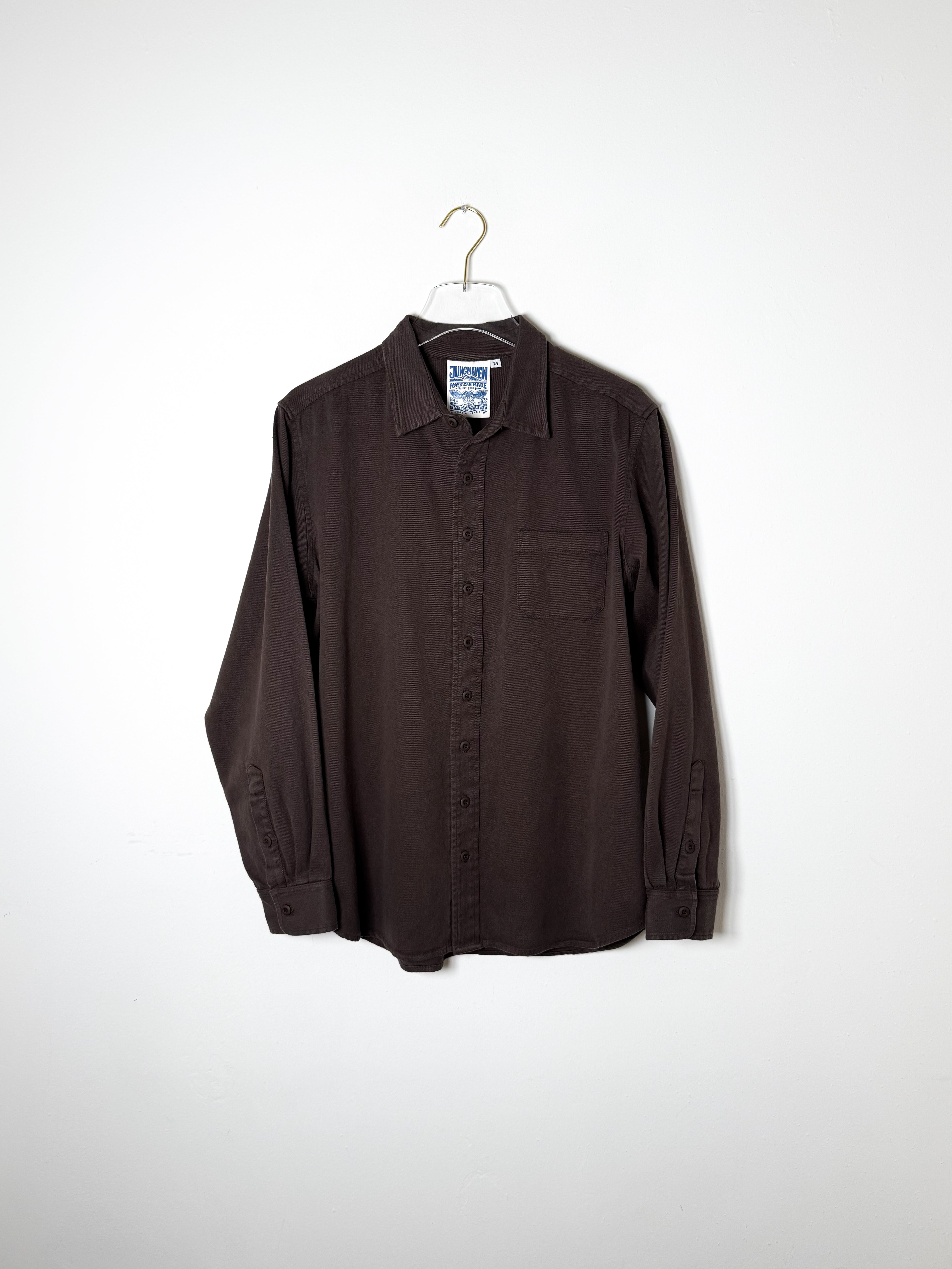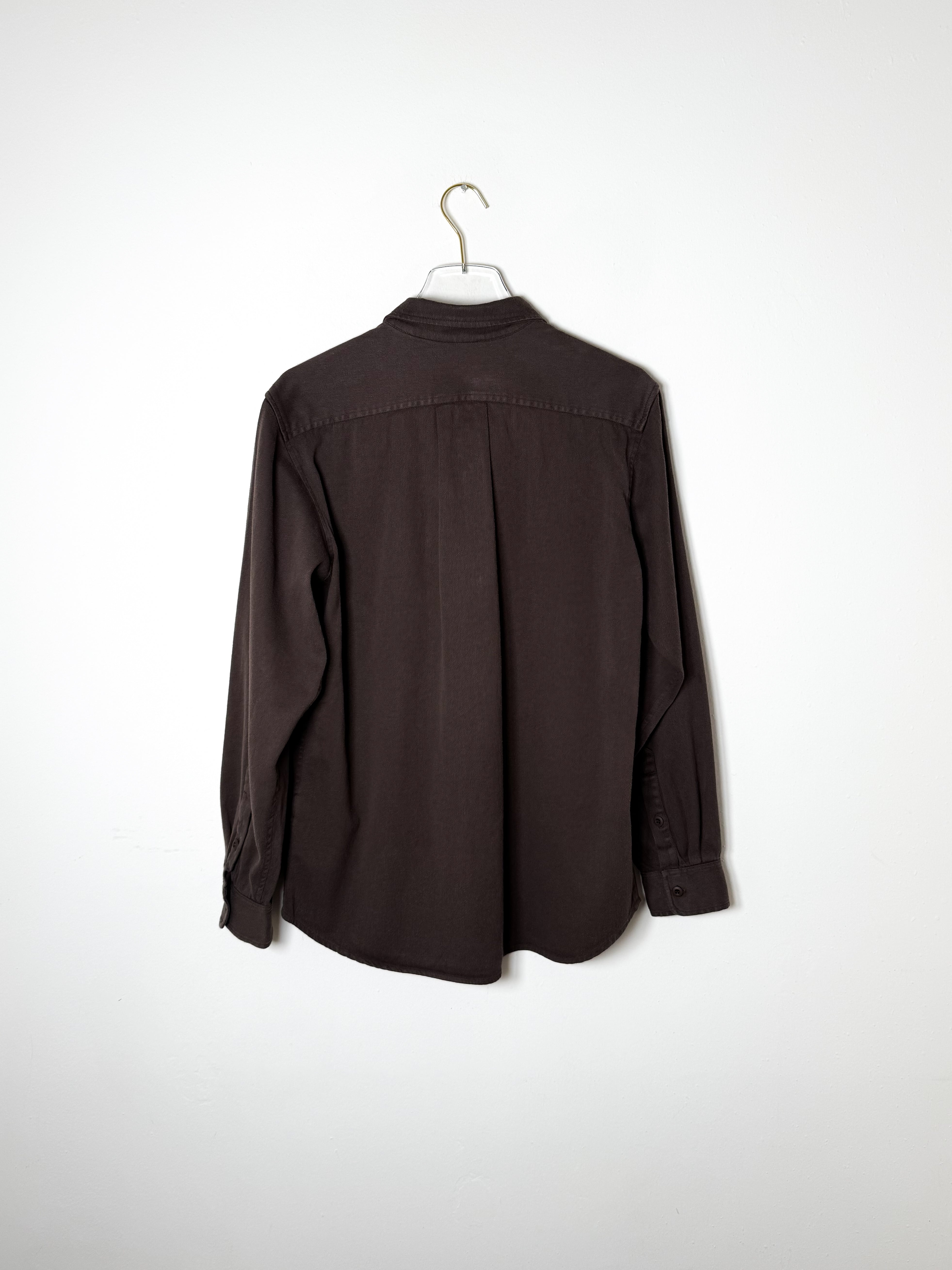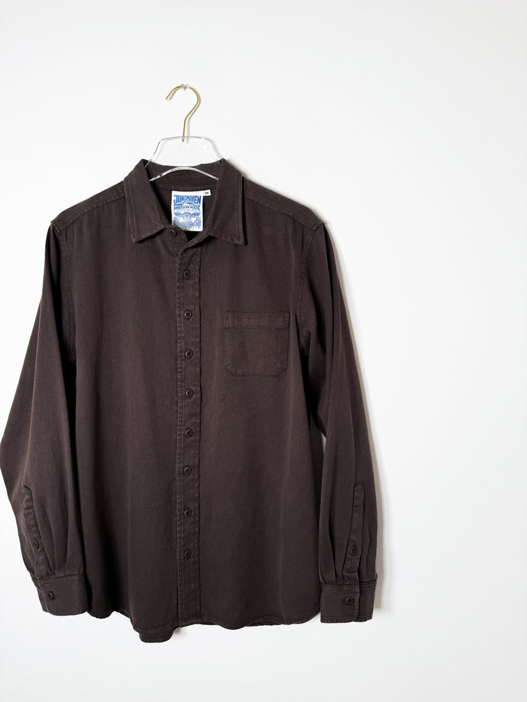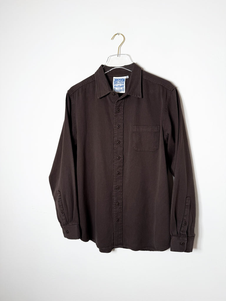 This dark brown button-up shirt features a woven hemp-cotton blend with a slight stretch for added comfort.