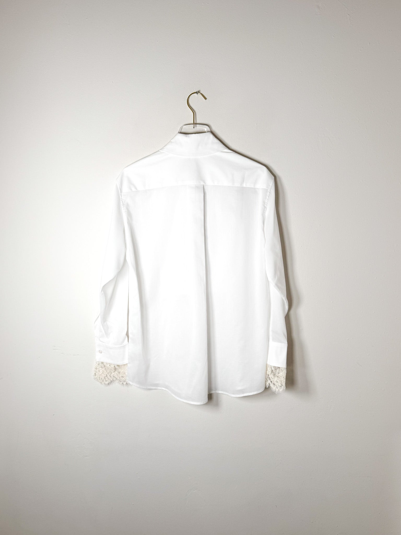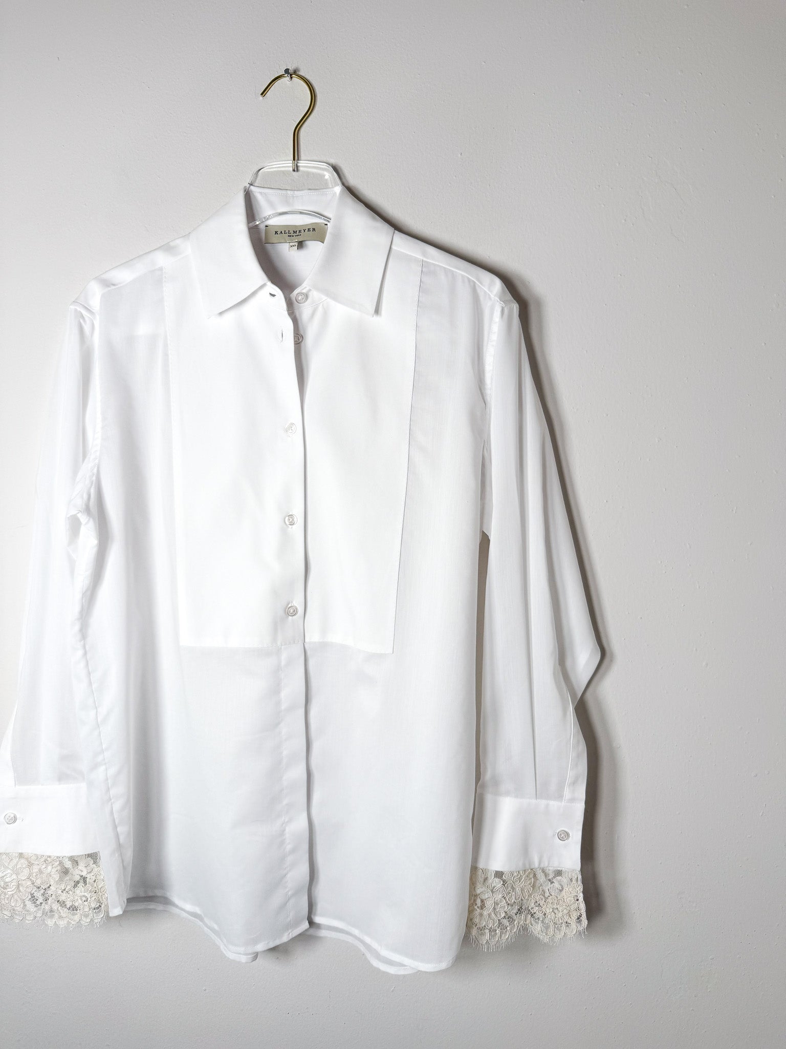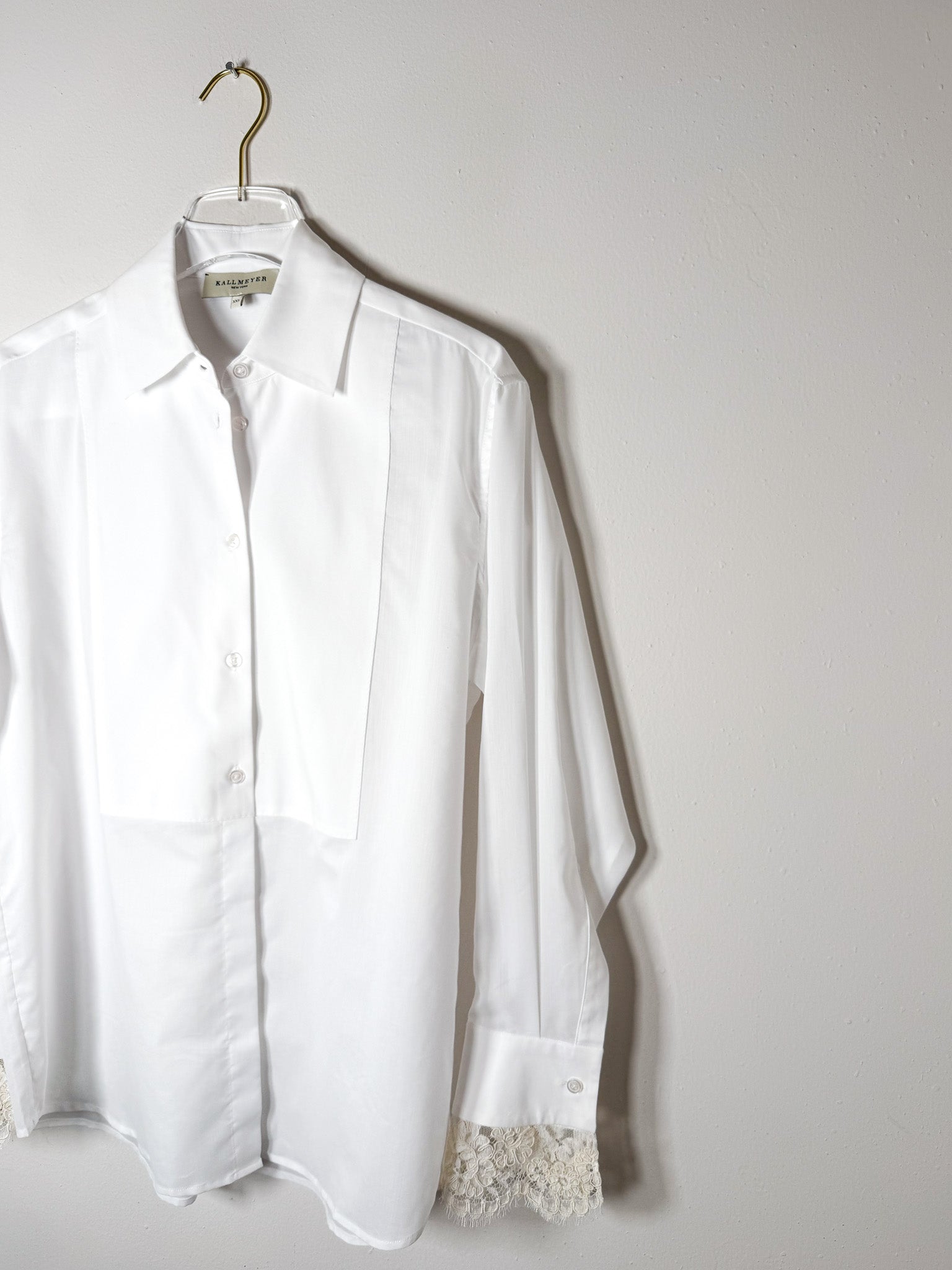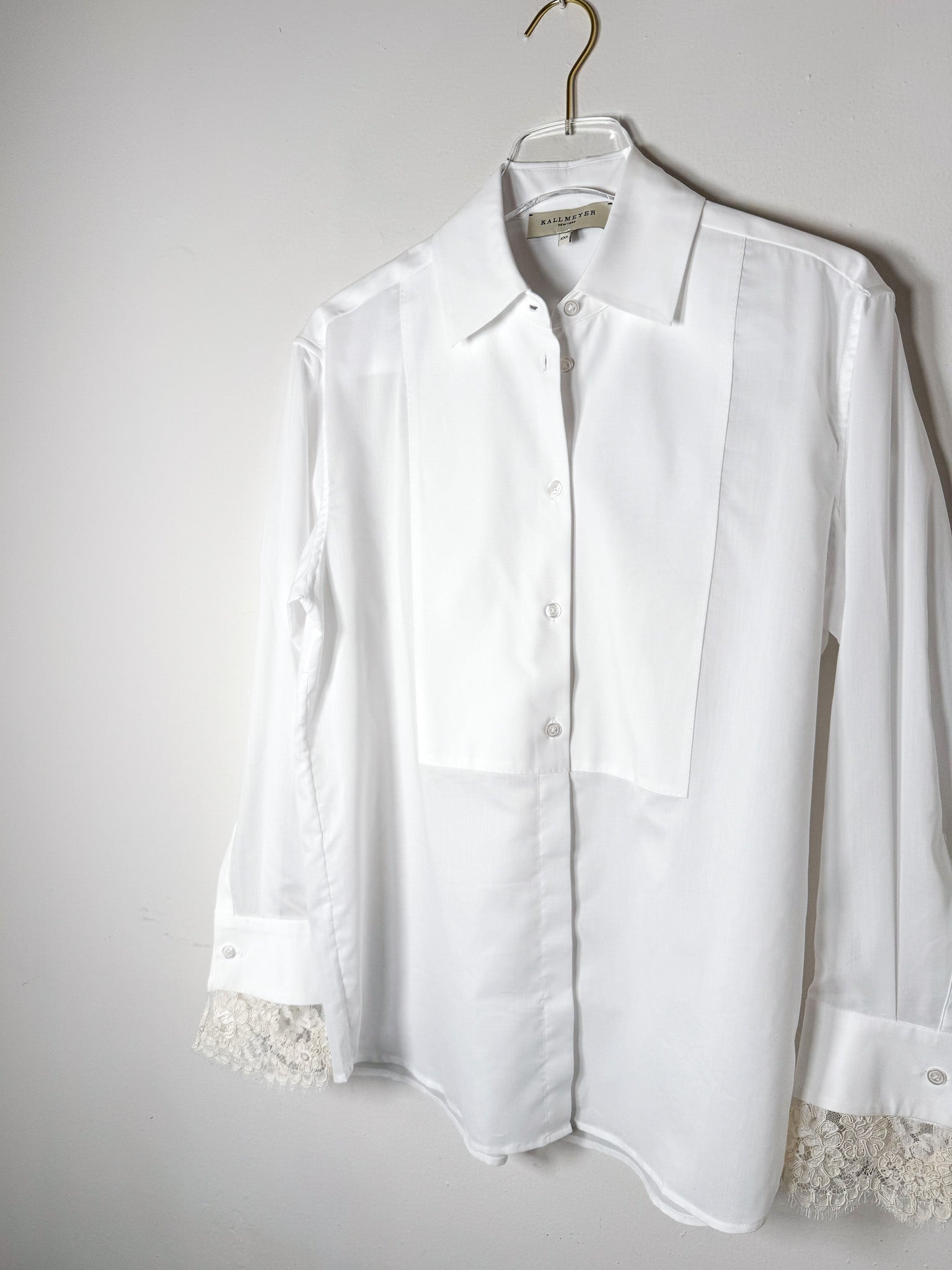 Button-down with bib front and point collar. Cotton poplin and voile construction with pique stitch bib. Long sleeves with French cuffs featuring lace detail and double-sided buttons. Relaxed fit with extended shirttail hem.