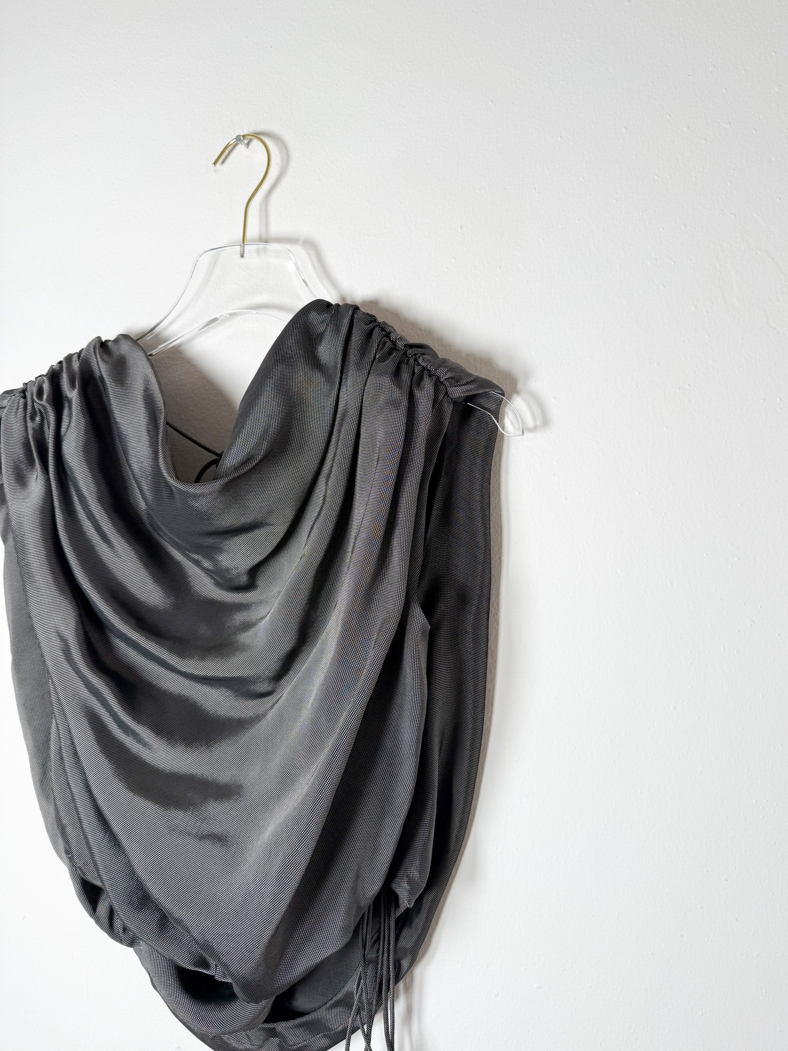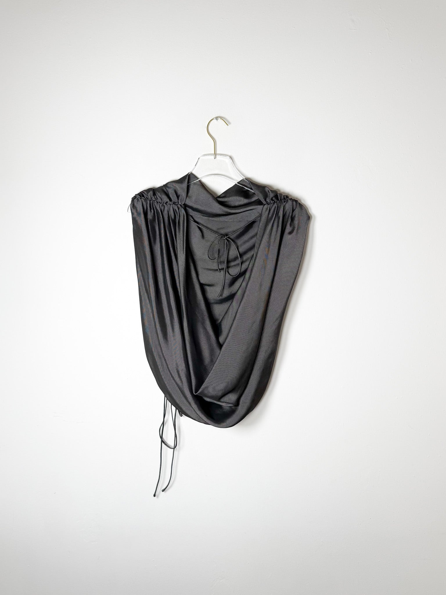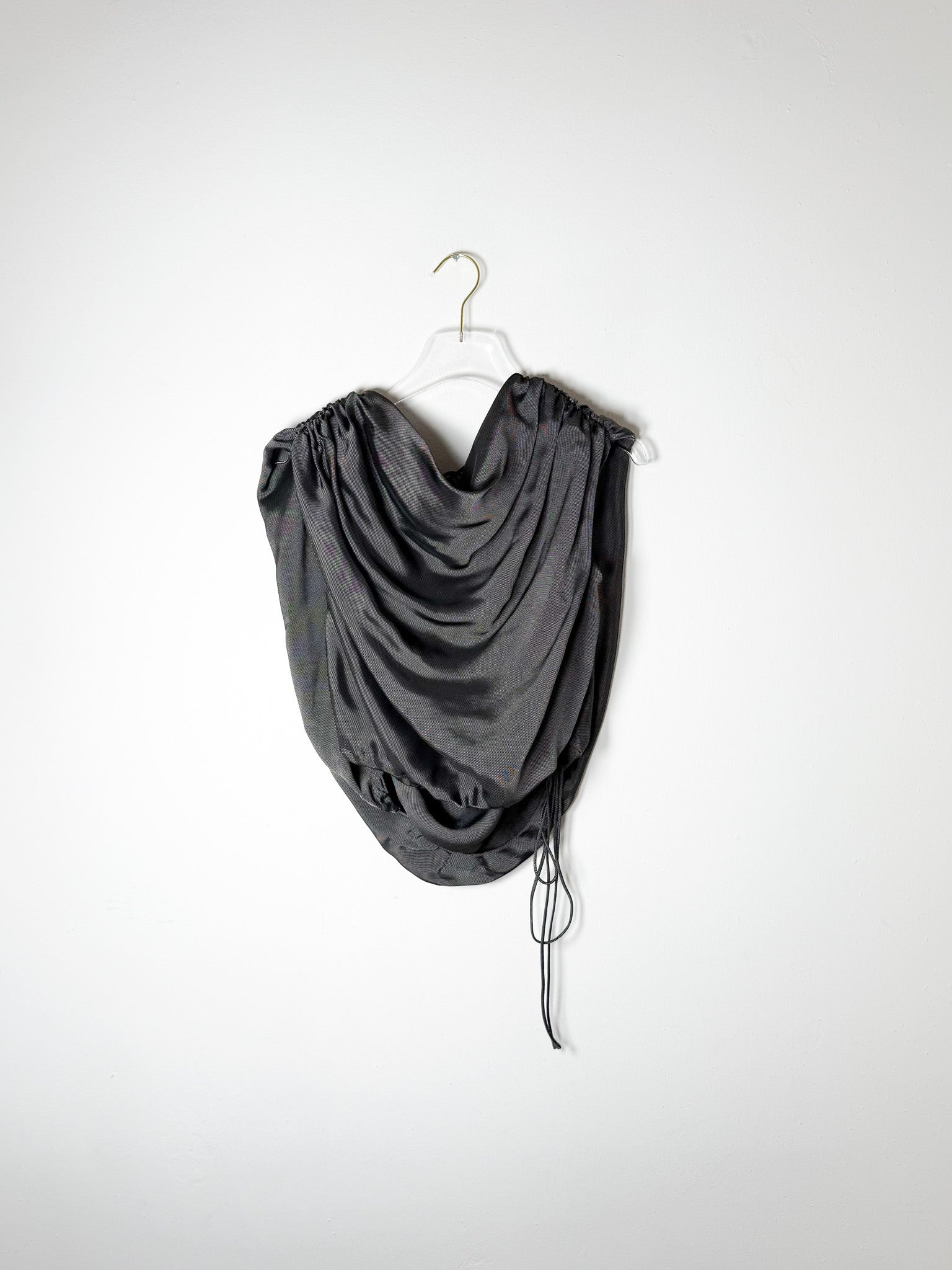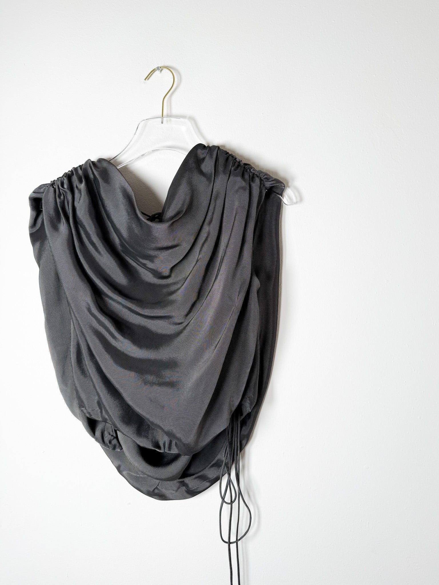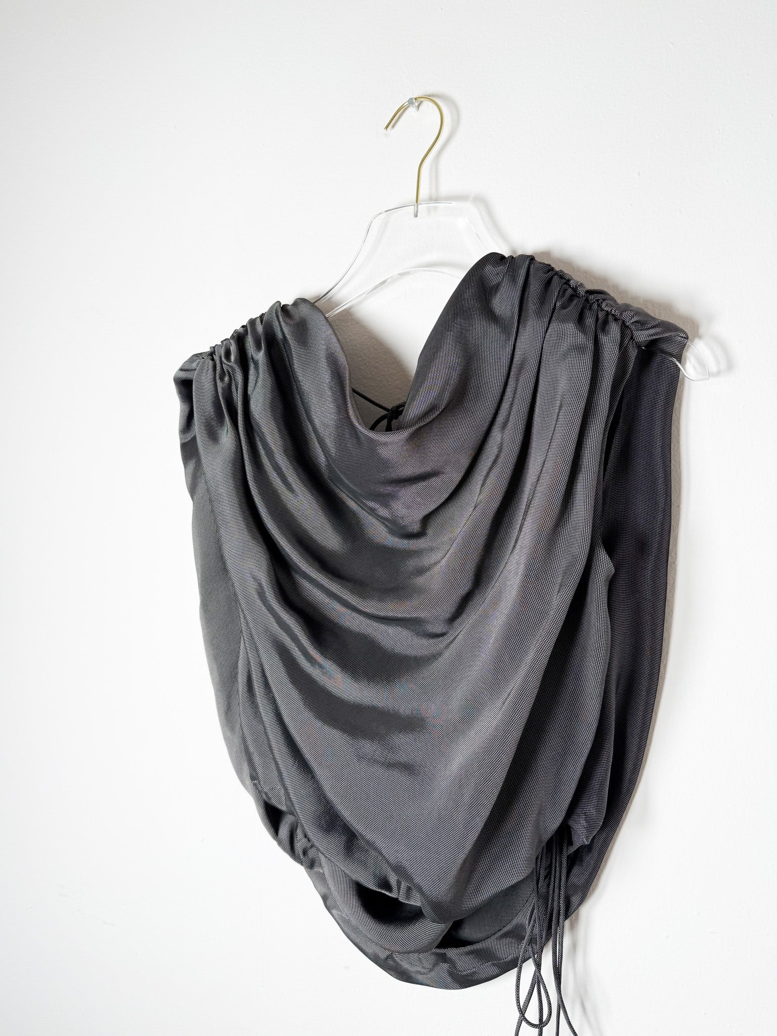 Bubble top in fluid viscose with gathered shoulders and high cowl neckline at front. Deep open cowl back. Adjustable spaghetti ties at back neck and waist for customized fit through the midriff.