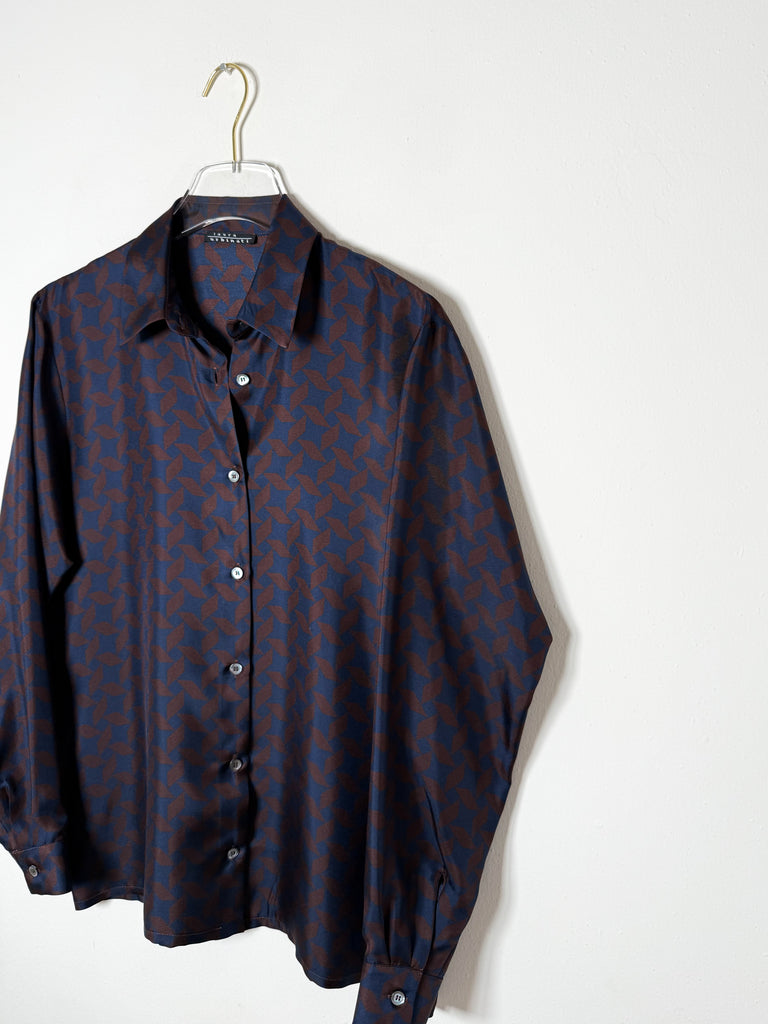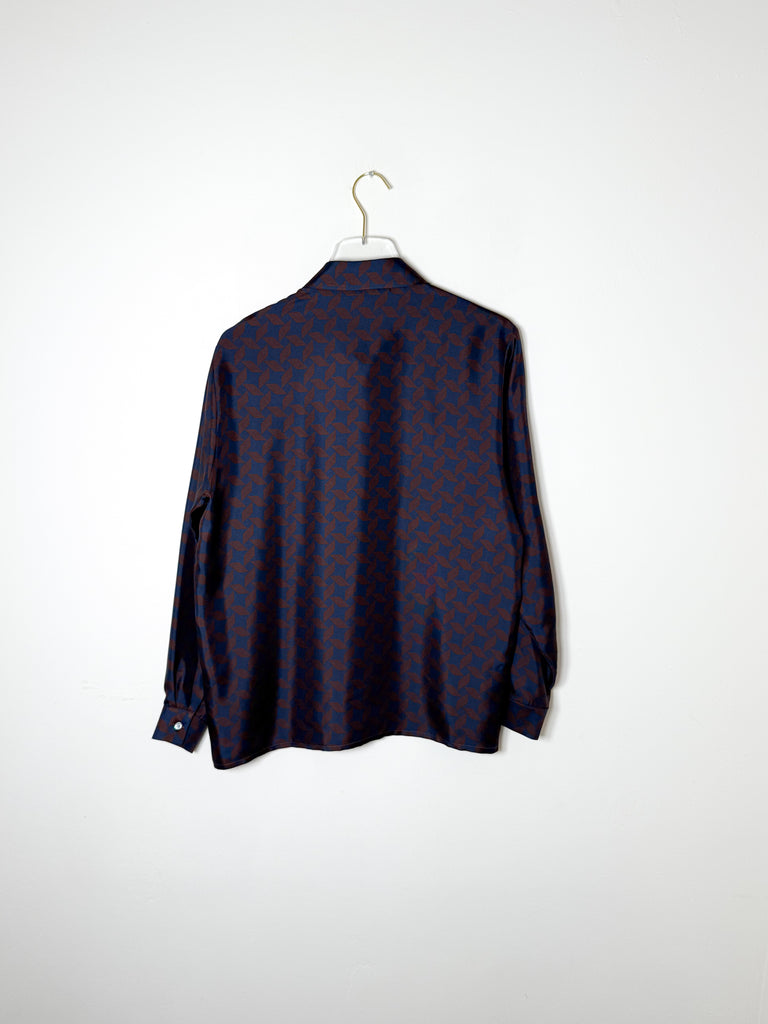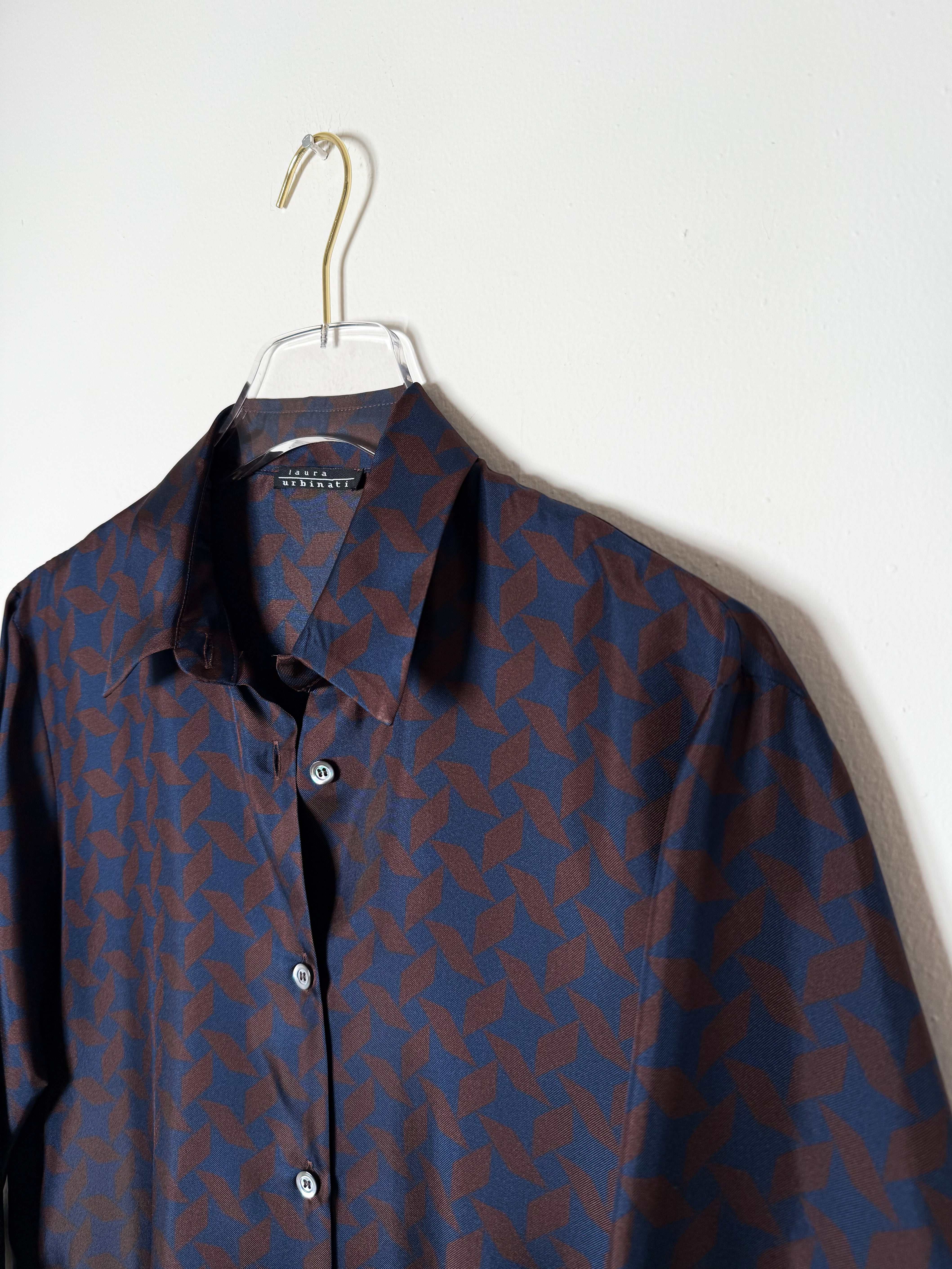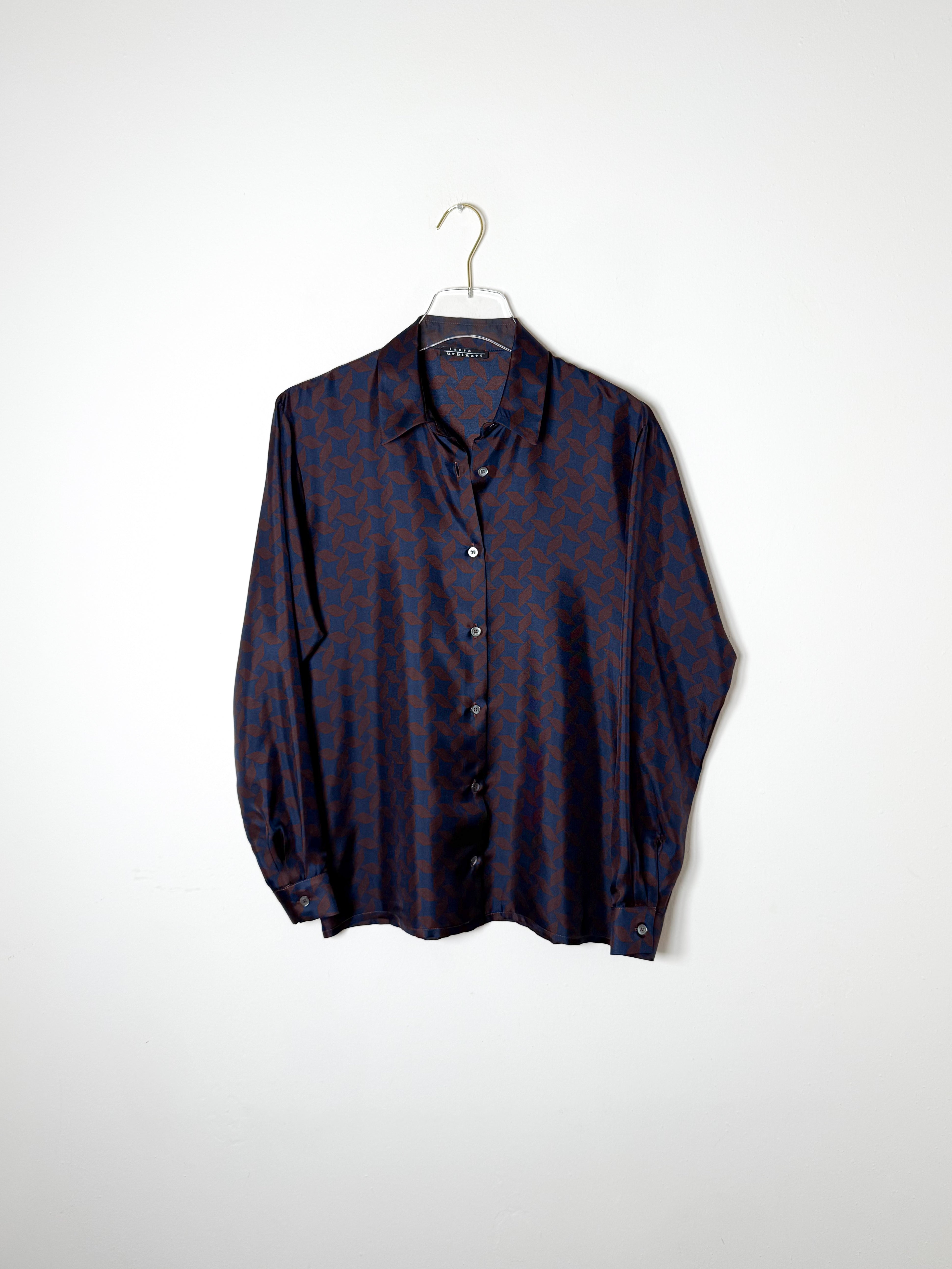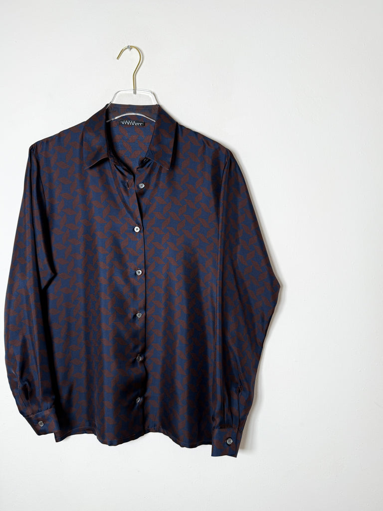 This woven silk button-down blouse features a relaxed fit and showcases an elegant dark navy and brown pattern, perfect for adding a touch of sophistication to your everyday wardrobe. This style does not have stretch.