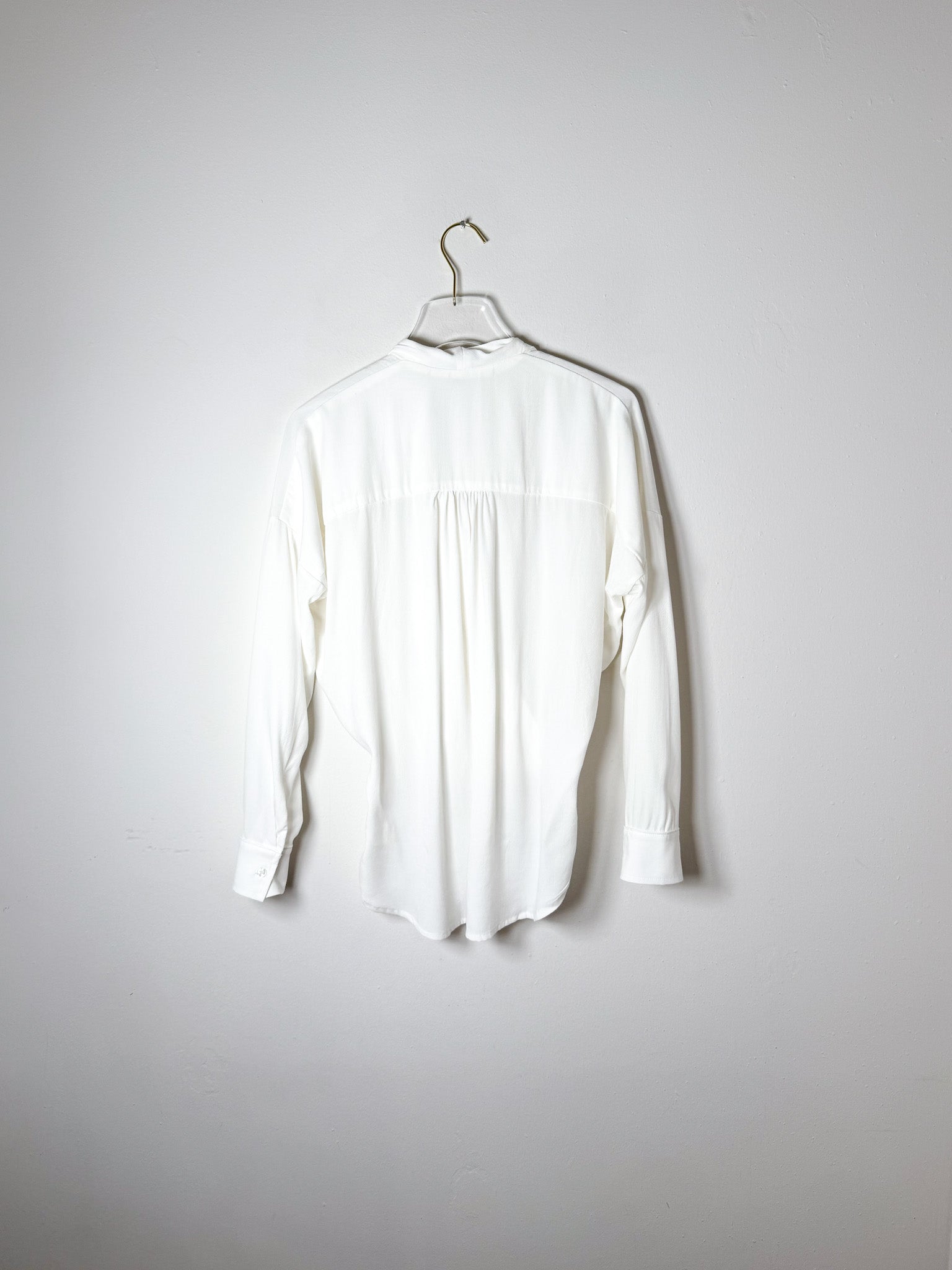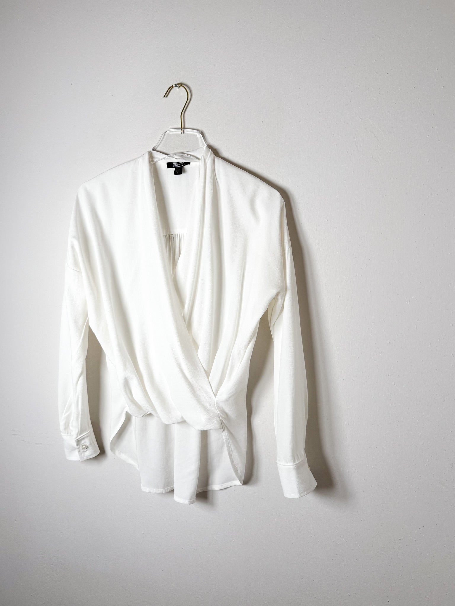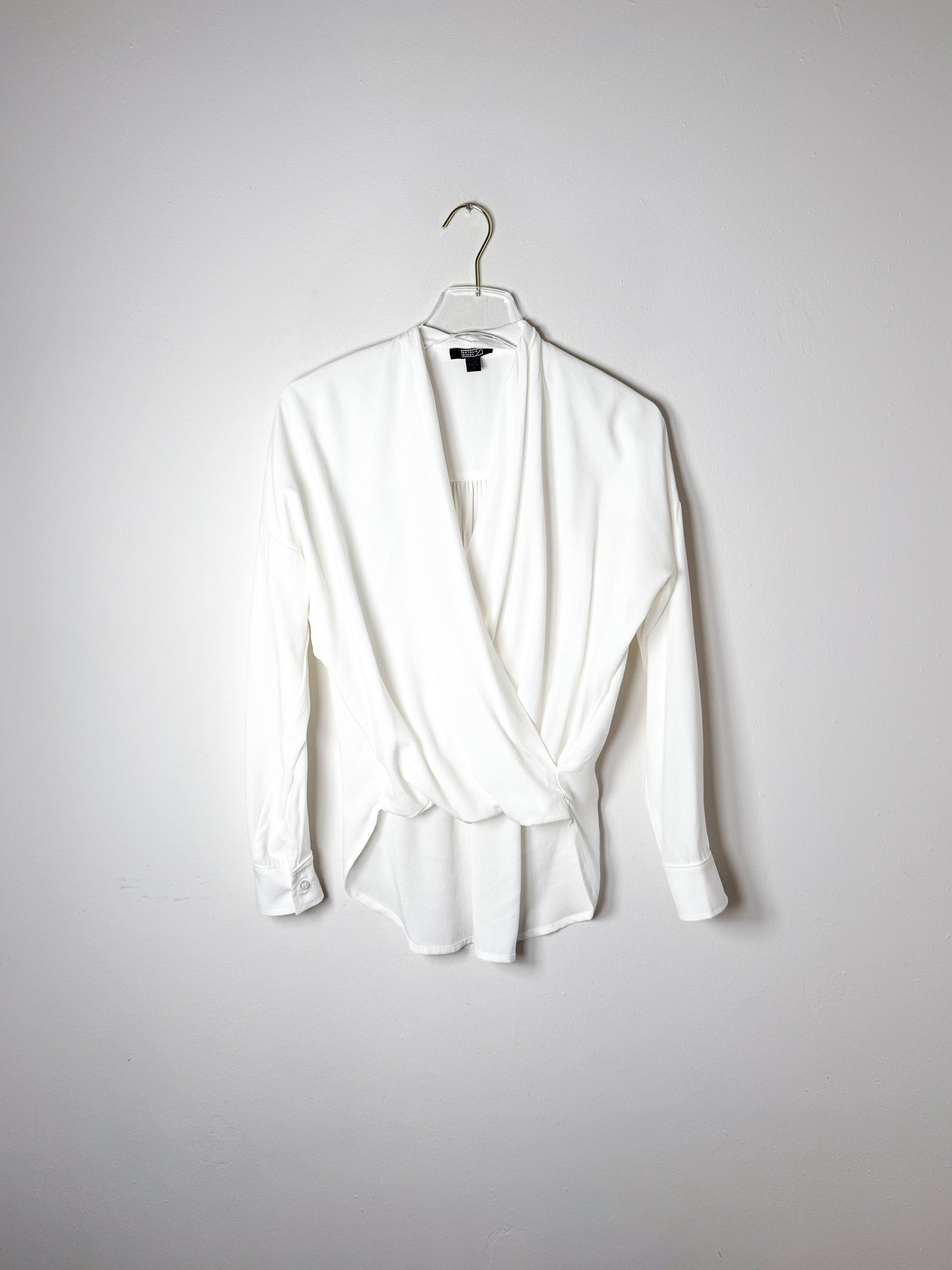 This blouse is criss-crossed in the front. Shorter front hem gives the illusion of that "half- tucked" polish. Back hem is longer. Sleeve cuffs.