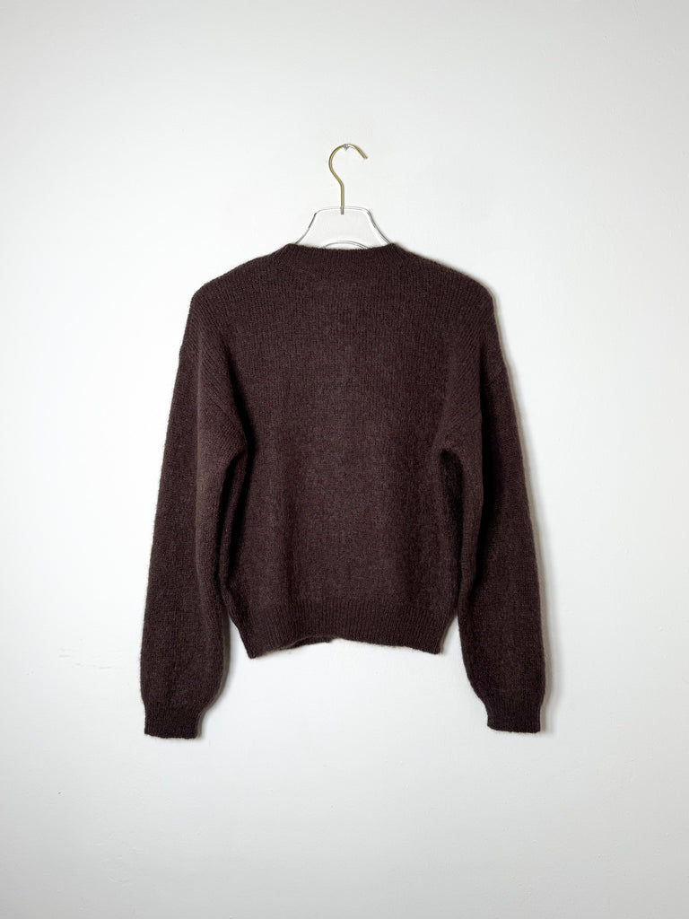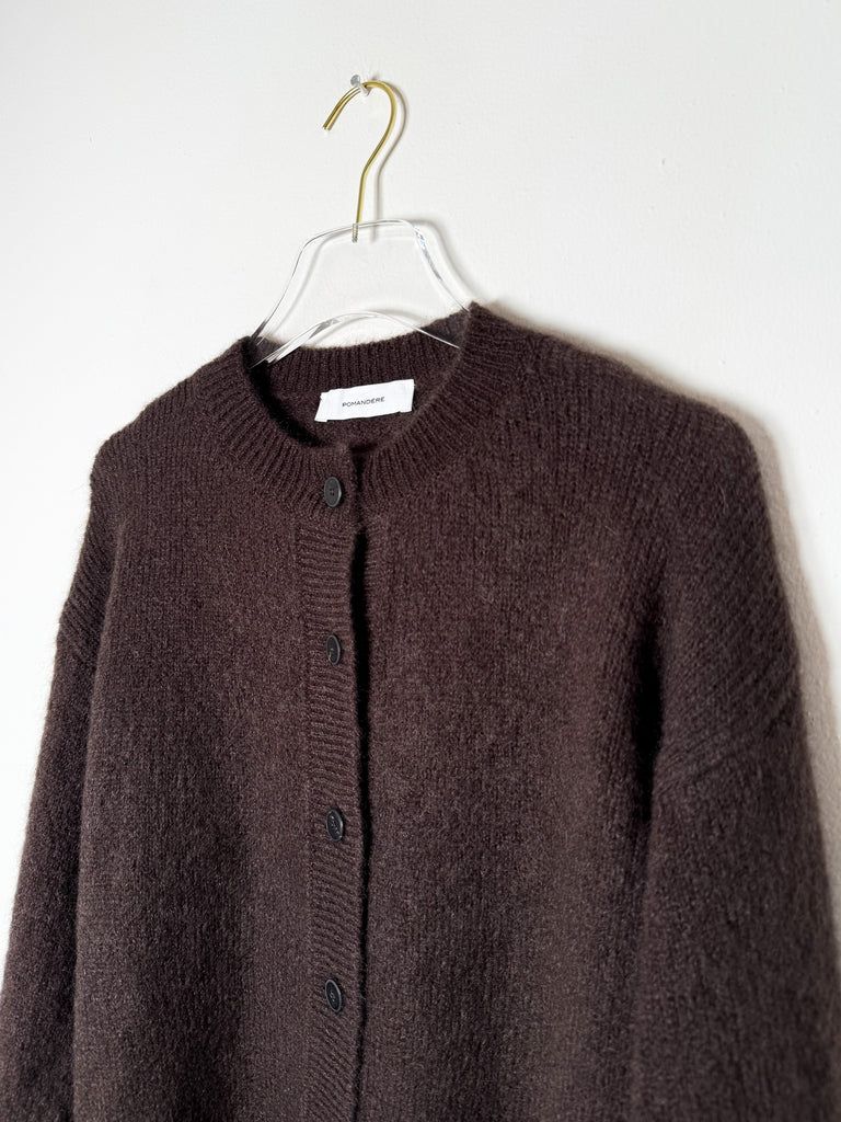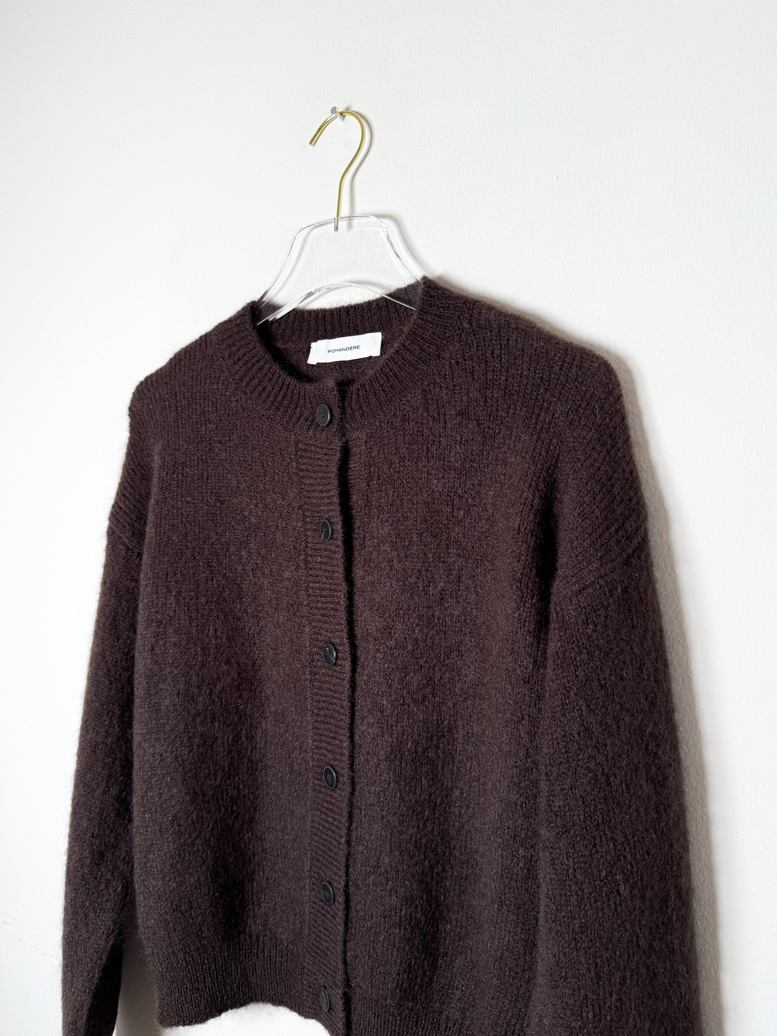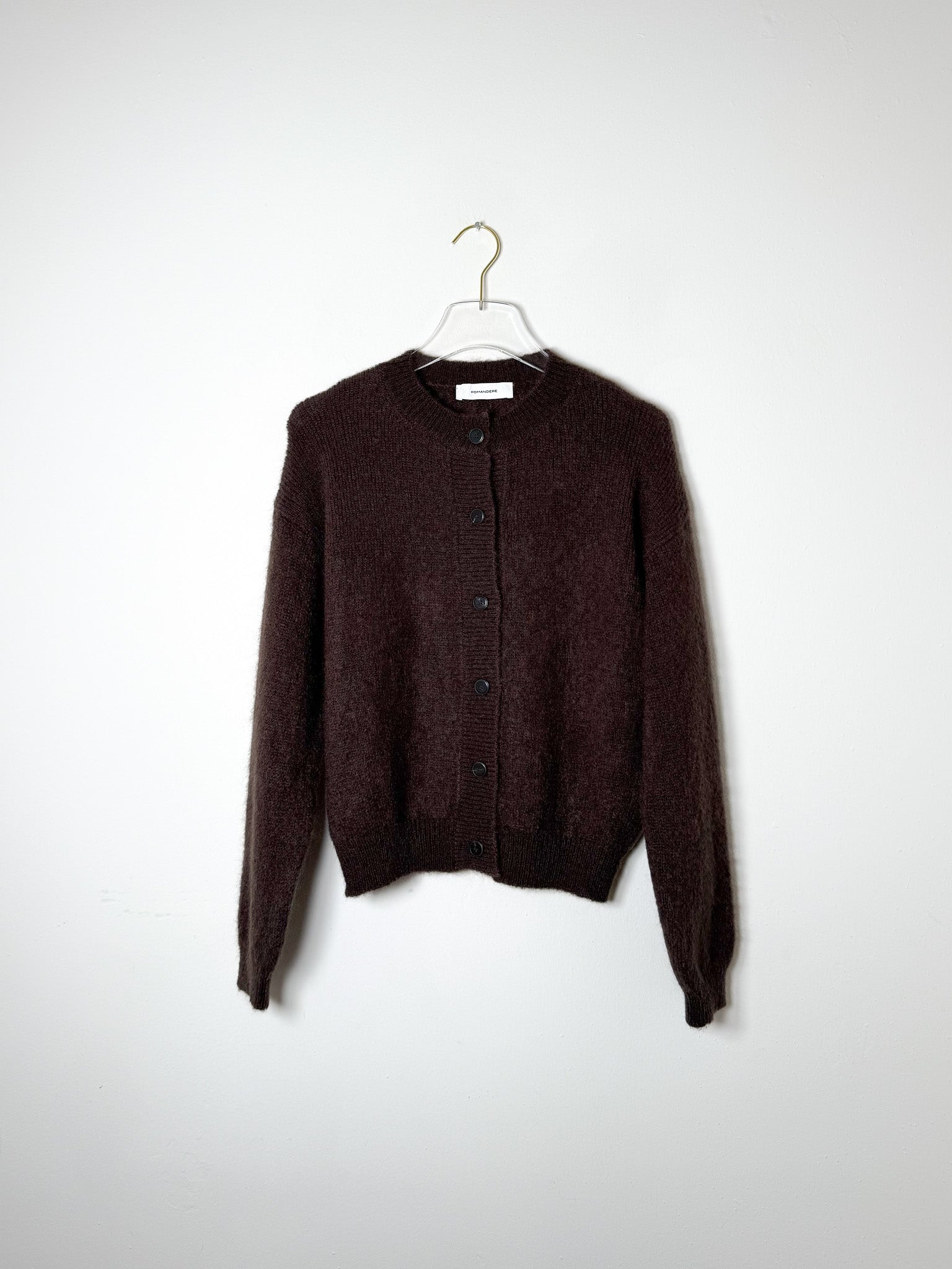 This lightweight mohair cardigan features a crewneck design and front buttons, offering a soft and breathable layer perfect for everyday wear.