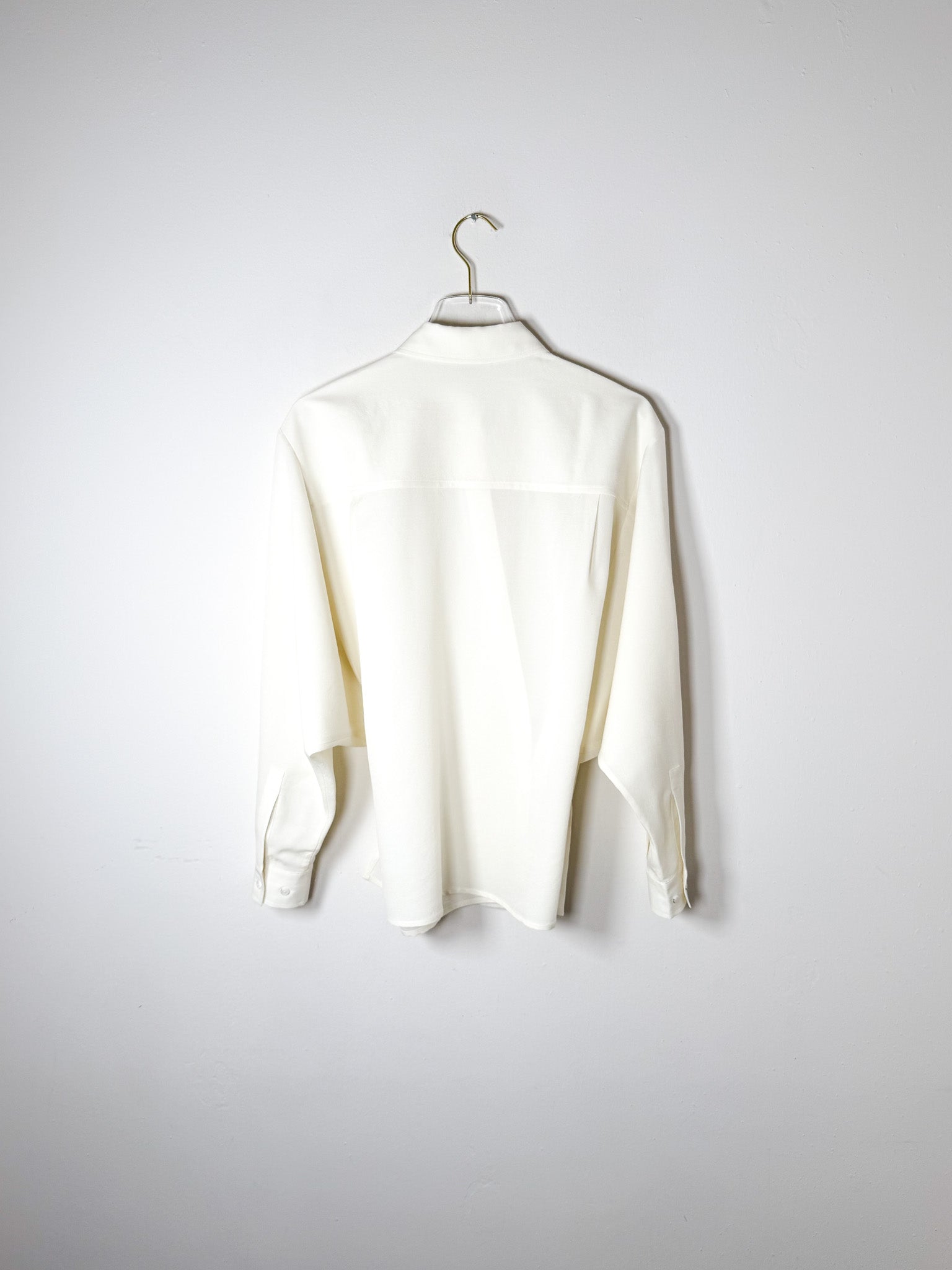 A wool-silk blend shirt with versatile styling options. The crossover front features internal side buttons that allow you to wear it crossed, open, or partially buttoned for different looks. Long rounded sleeves and wash finishing create a relaxed yet polished aesthetic that works across occasions.