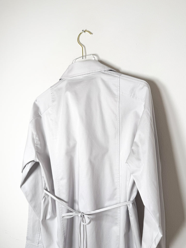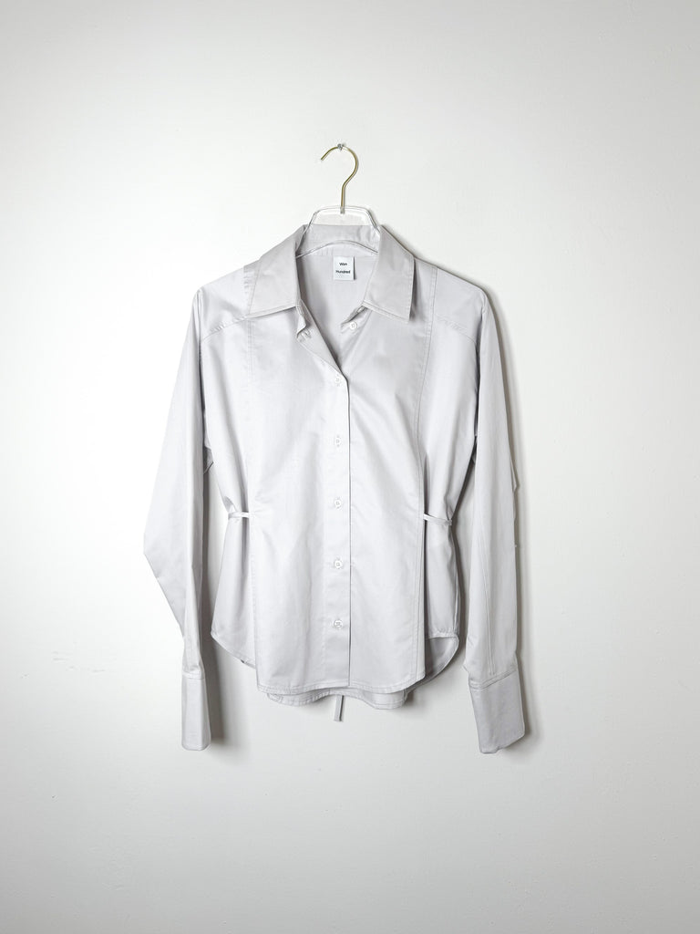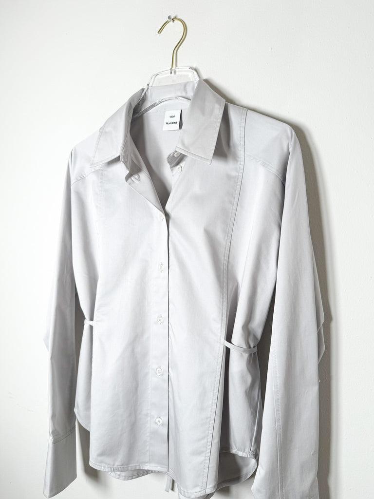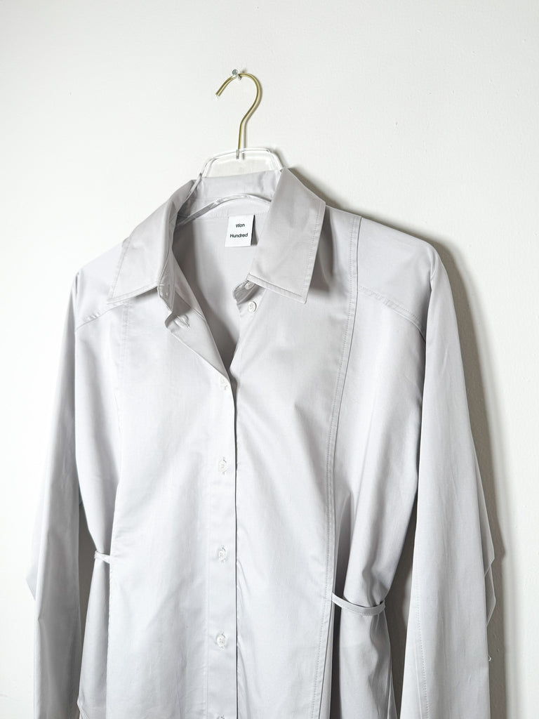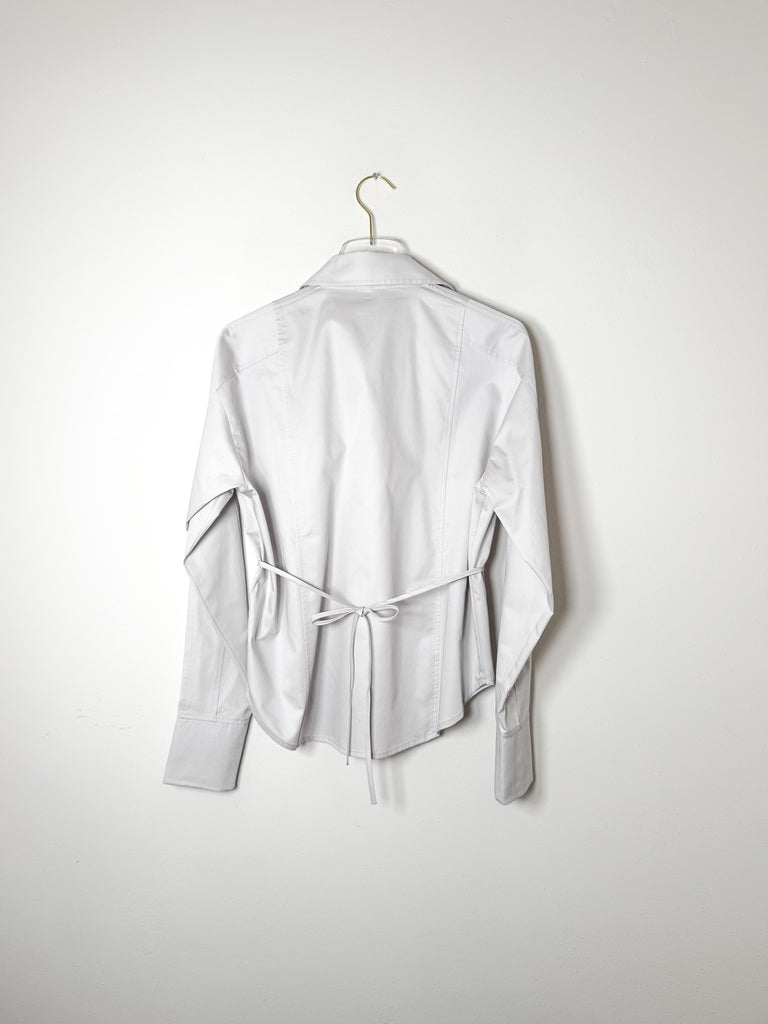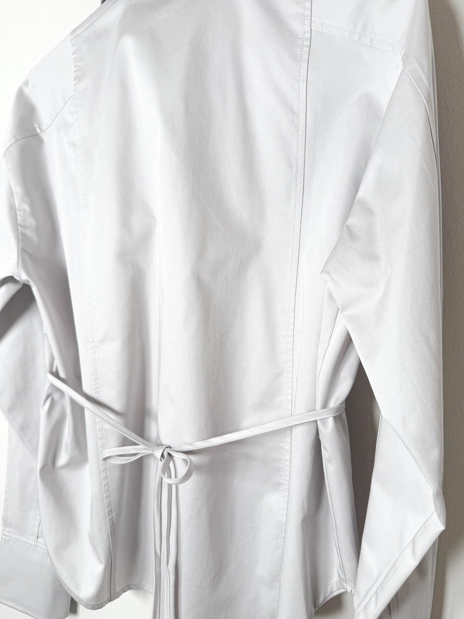 This tailored cotton blouse features buttons down the front and includes a tie that can be styled at the front or back to accentuate the waist.