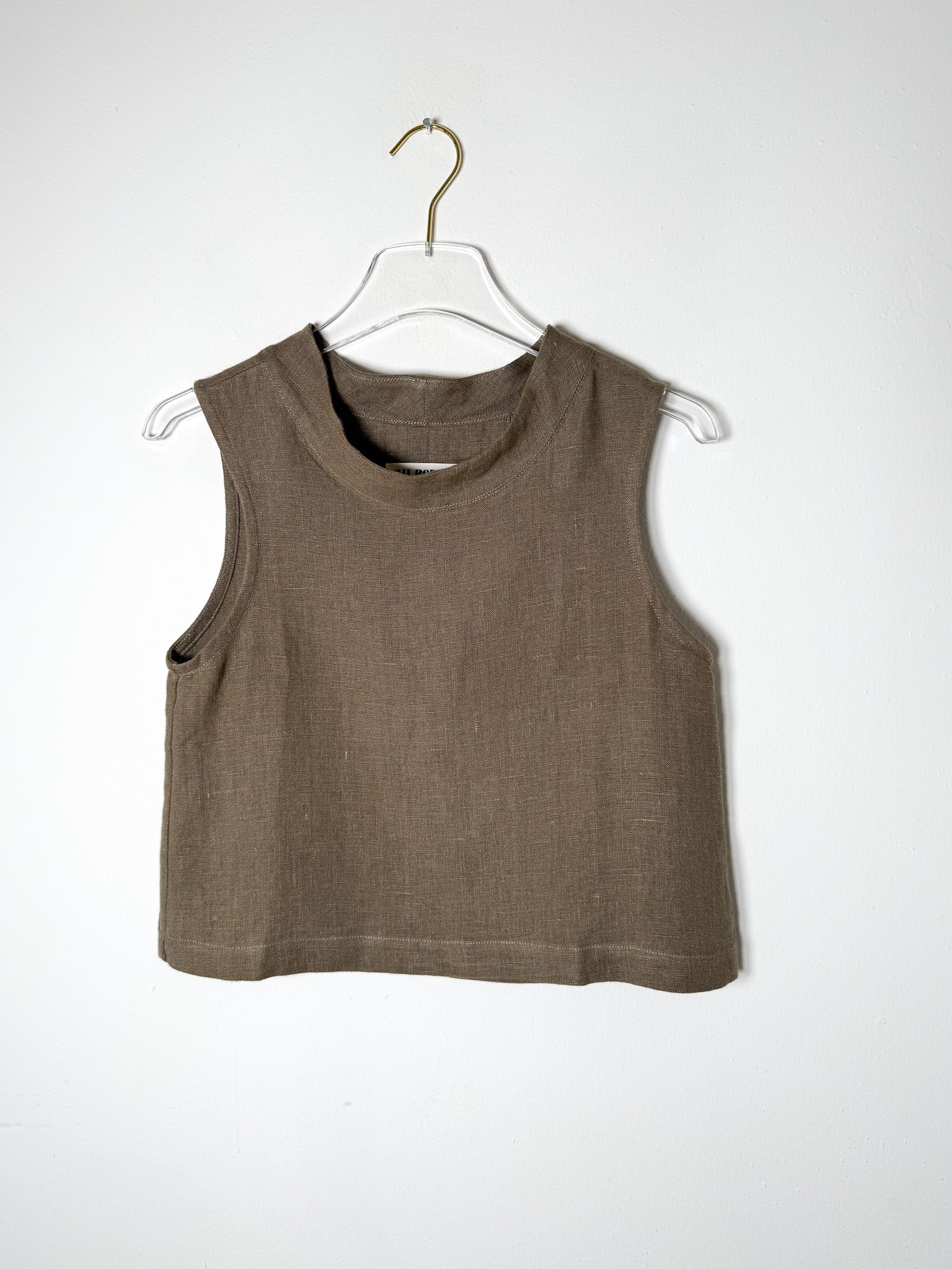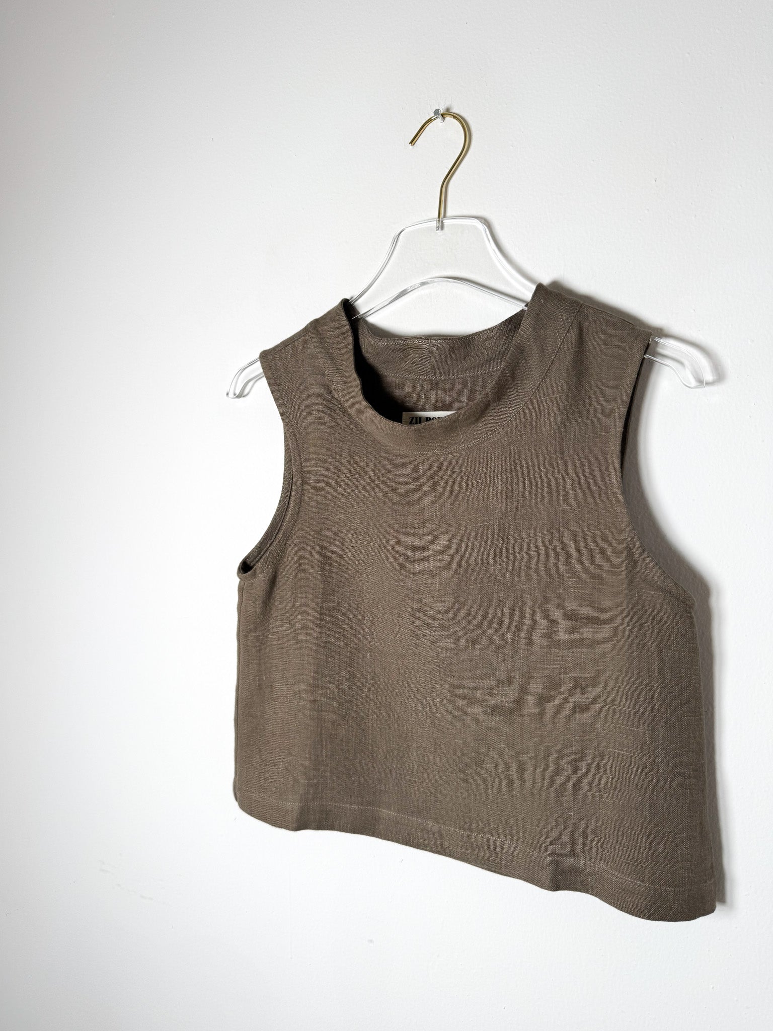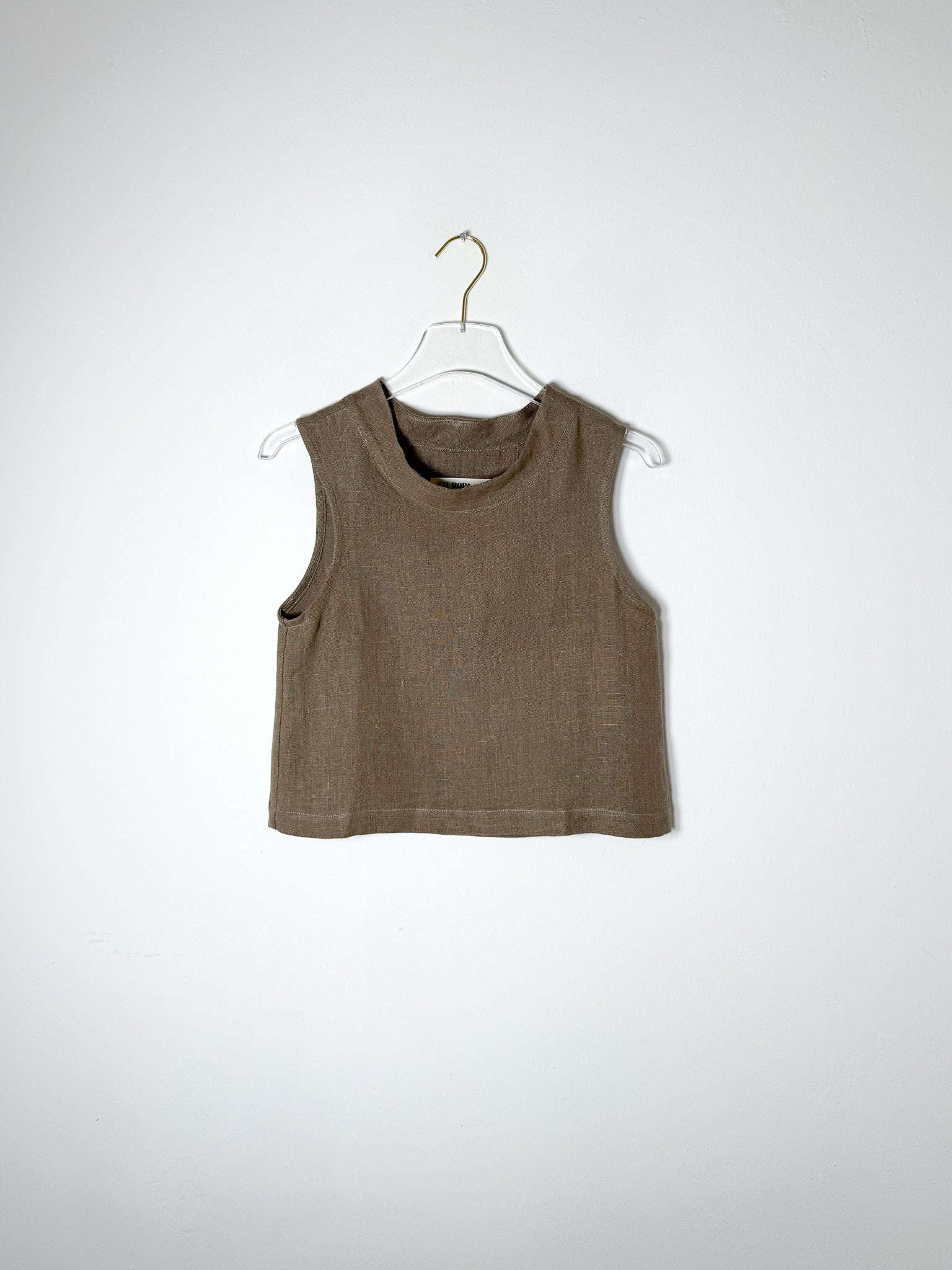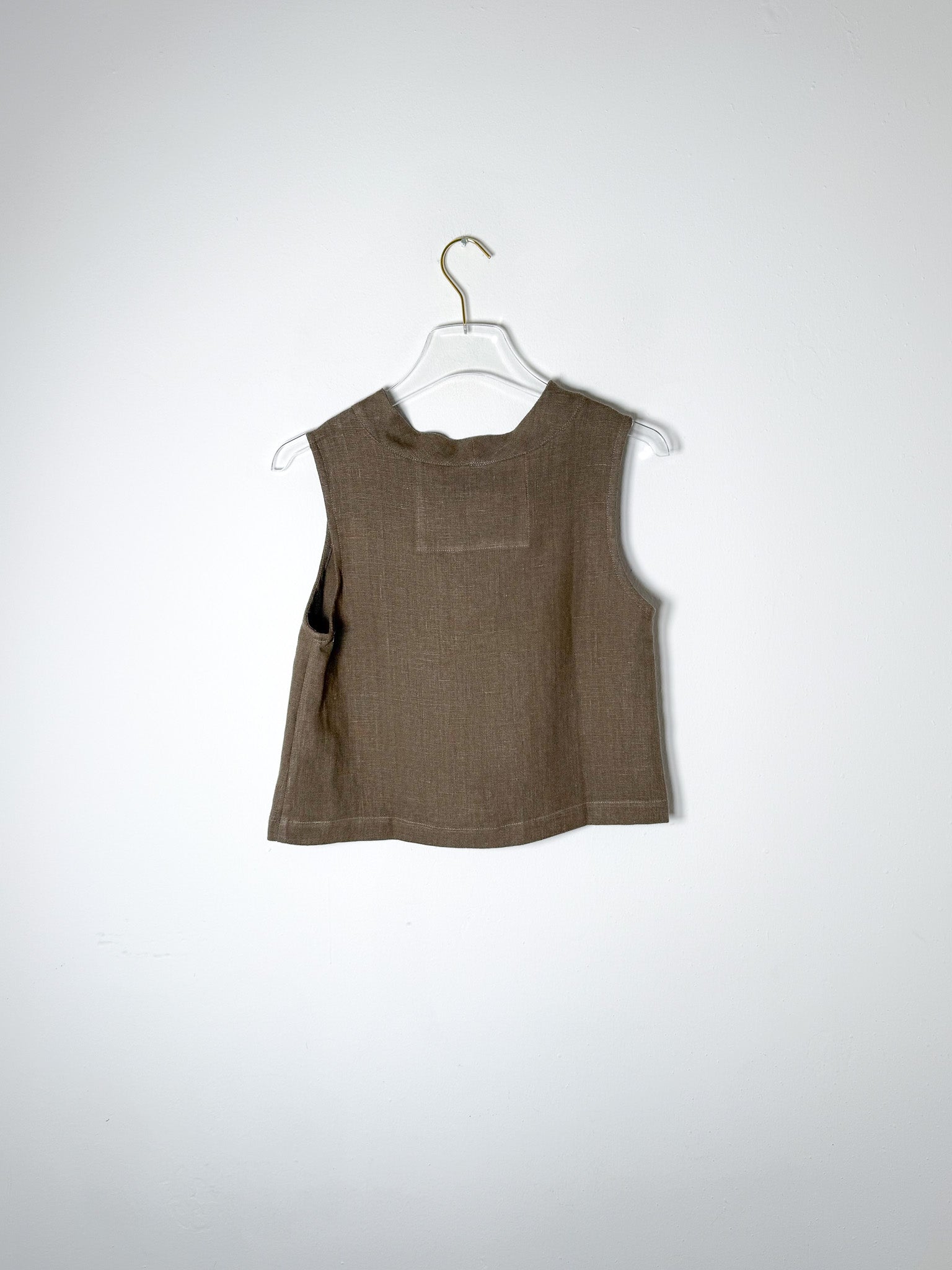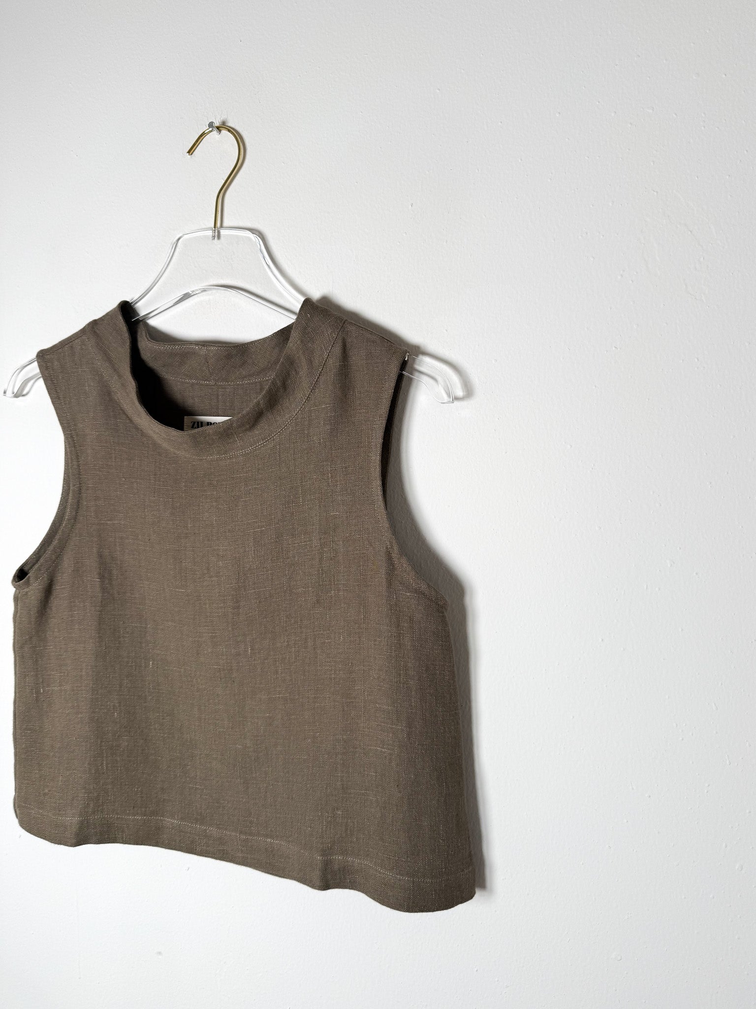 Heavy linen sleeveless top with a boxy fit and banded collar.